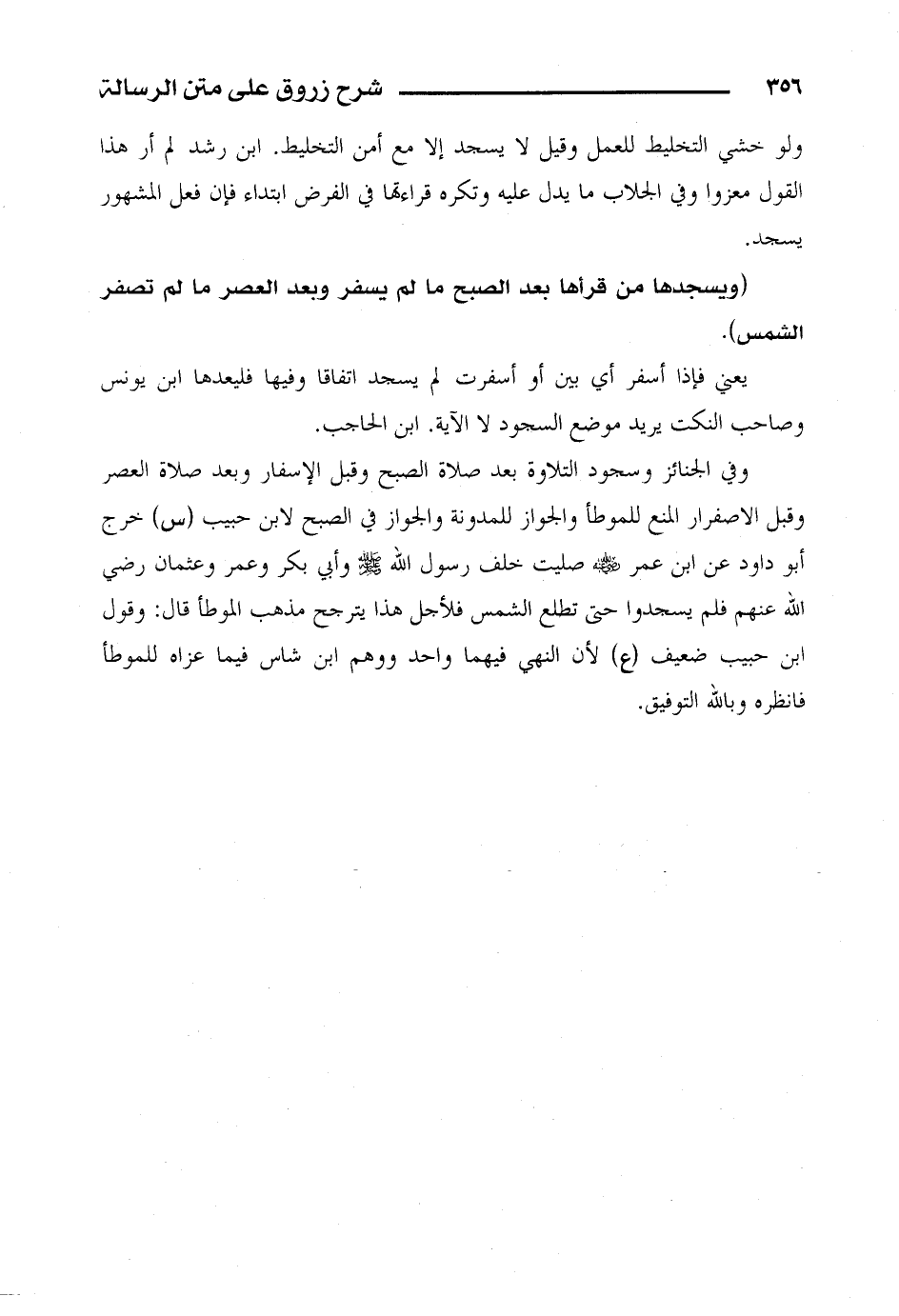 وفي الجنائز وسجود التلاوة بعد صلاة الصبح وقبل الإسفار وبعد صلاة العصر وقبل الاصفرار المنع للموطأ والجواز للمدونة والجواز في الصبح لابن حبيب (س) خرج أبو داود عن ابن عمر رضي الله عنه صليت خلف رسول الله صلى الله عليه وسلم وأبي بكر وعمر وعثمان رضي الله عنهم فلم يسجدوا حتى تطلع الشمس فلأجل هذا يترجح مذهب الموطأ قال: وقول ابن حبيب ضعيف (ع) لأن النهي فيهما واحد ووهم ابن شاس فيما عزاه للموطأ فانظره وبالله التوفيق.