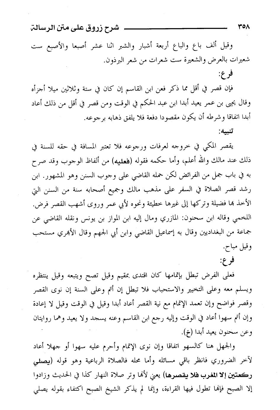 يقصر المكي في خروجه لعرفات ورجوعه فلا تعتبر المسافة في حقه للسنة في ذلك عند مالك والله أعلم، وأما حكمه فقوله (فعليه) من ألفاظ الوجوب وقد صرح به في باب جمل من الفرائض لكن حمله القاضي على وجوب السنن وهو المشهور. ابن رشد قصر الصلاة في السفر على مذهب مالك وجميع أصحابه سنة من السنن التي الأخذ بها فضيلة وتركها إلى غيرها خطيئة لأبي عمر وروى أشهب القصر فرض.