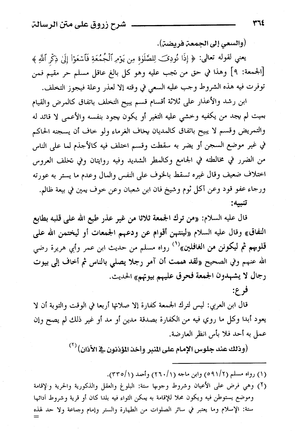 قال عليه السلام: «من ترك الجمعة ثلاثا من غير عذر طبع الله على قلبه بطابع النفاق» وقال عليه السلام: «لينتهن أقوام عن ودعهم الجمعات أو ليختمن الله على قلوبهم ثم ليكونن من الغافلين» رواه مسلم من حديث ابن عمر وأبي هريرة رضي الله عنه وفي الصحيح «لقد هممت إن آمر رجلا يصلي الناس ثم أخاف إلى بيوت رجال لا يشهدون الجمعة فحرق عليهم بيوتهم» الحديث.
