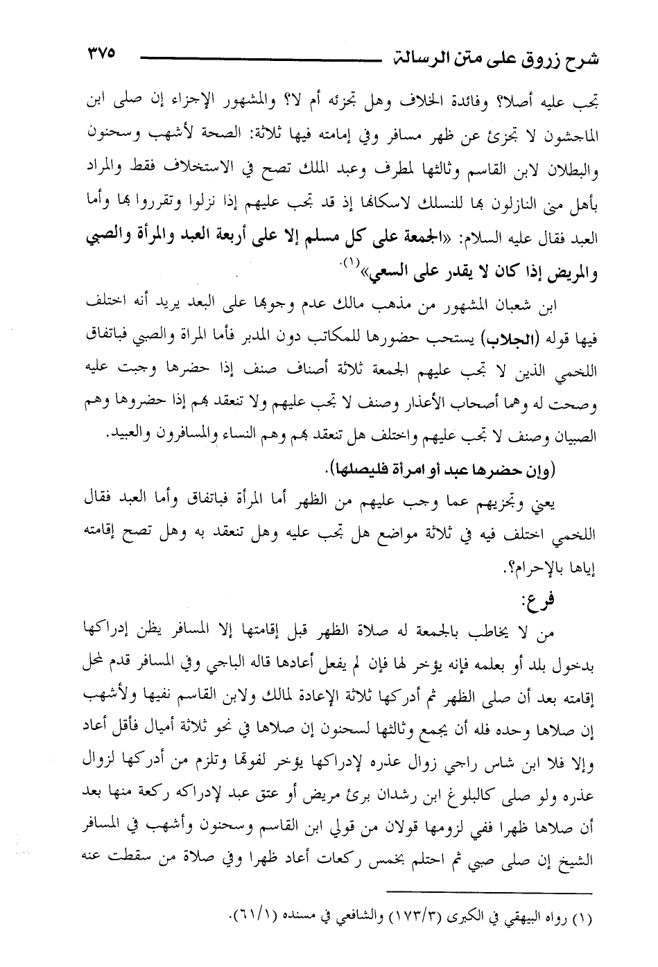 تجب عليه أصلا؟ وفائدة الخلاف وهل تجزئه أم لا؟ والمشهور الإجزاء إن صلى ابن الماجشون لا تجزئ عن ظهر مسافر وفي إمامته فيها ثلاثة: الصحة لأشهب وسحنون والبطلان لابن القاسم وثالثها لمطرف وعبد الملك تصح في الاستخلاف فقط والمراد بأهل منى النازلون بها للنسك لإسكانها إذ قد تجب عليهم إذا نزلوا وتقرروا بها وأما العبد فقال عليه السلام: «الجمعة على كل مسلم إلا على أربعة العبد والمرأة والصبي والمريض إذا كان لا يقدر على السعي».