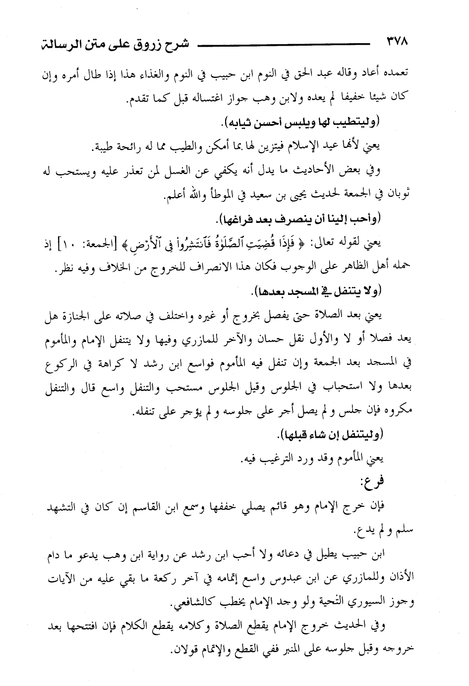 ابن حبيب يطيل في دعائه ولا أحب ابن رشد عن رواية ابن وهب يدعو ما دام الأذان وللمازري عن ابن عبدوس واسع إتمامه في آخر ركعة ما بقي عليه من الآيات وجوز السيوري التحية ولو وجد الإمام يخطب كالشافعي.