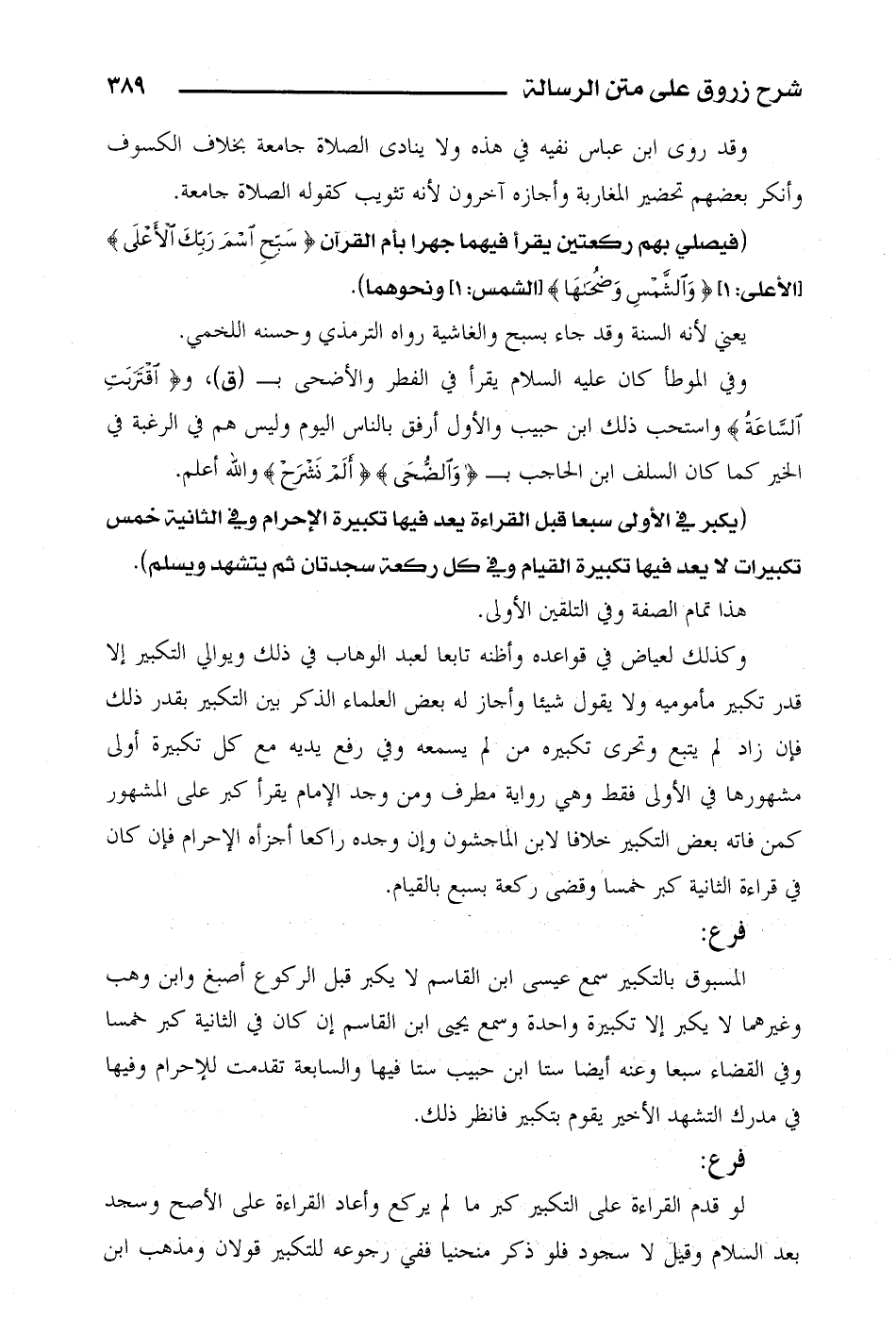 وفي الموطأ كان عليه السلام يقرأ في الفطر والأضحى بـ (ق)،و {اقتربت الساعة} واستحب ذلك ابن حبيب والأول أرفق بالناس اليوم وليس هم في الرغبة في الخير كما كان السلف ابن الحاجب بـ {والضحى} {ألم نشرح} والله أعلم.