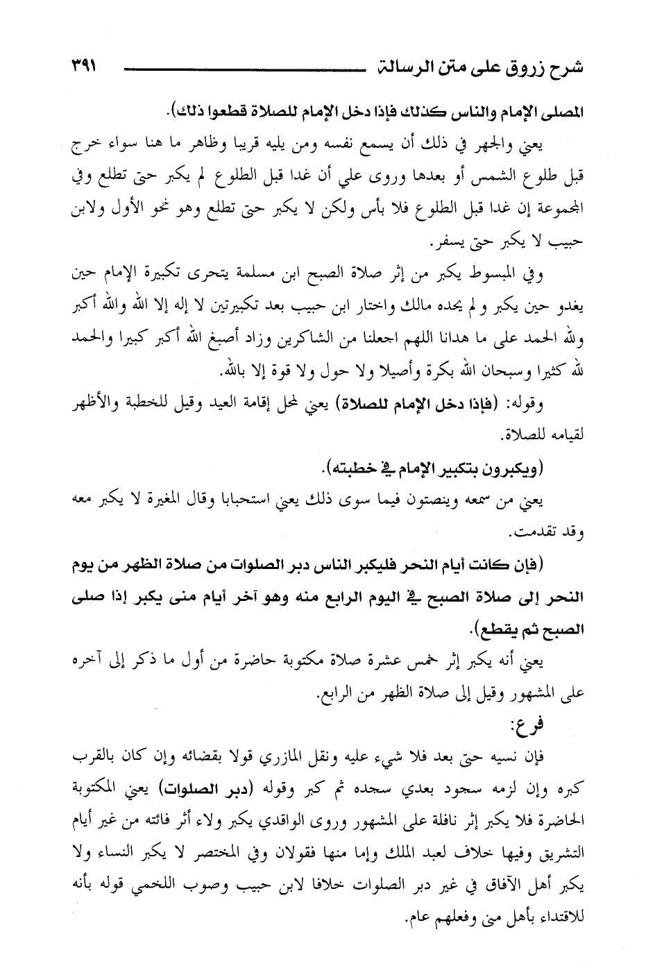 وفي المبسوط يكبر من إثر صلاة الصبح ابن مسلمة يتحرى تكبيرة الإمام حين يغدو حين يكبر ولم يحده مالك واختار ابن حبيب بعد تكبيرتين لا إله إلا الله والله أكبر ولله الحمد على ما هدانا اللهم اجعلنا من الشاكرين وزاد أصبغ الله أكبر كبيرا والحمد لله كثيرا وسبحان الله بكرة وأصيلا ولا حول ولا قوة إلا بالله.