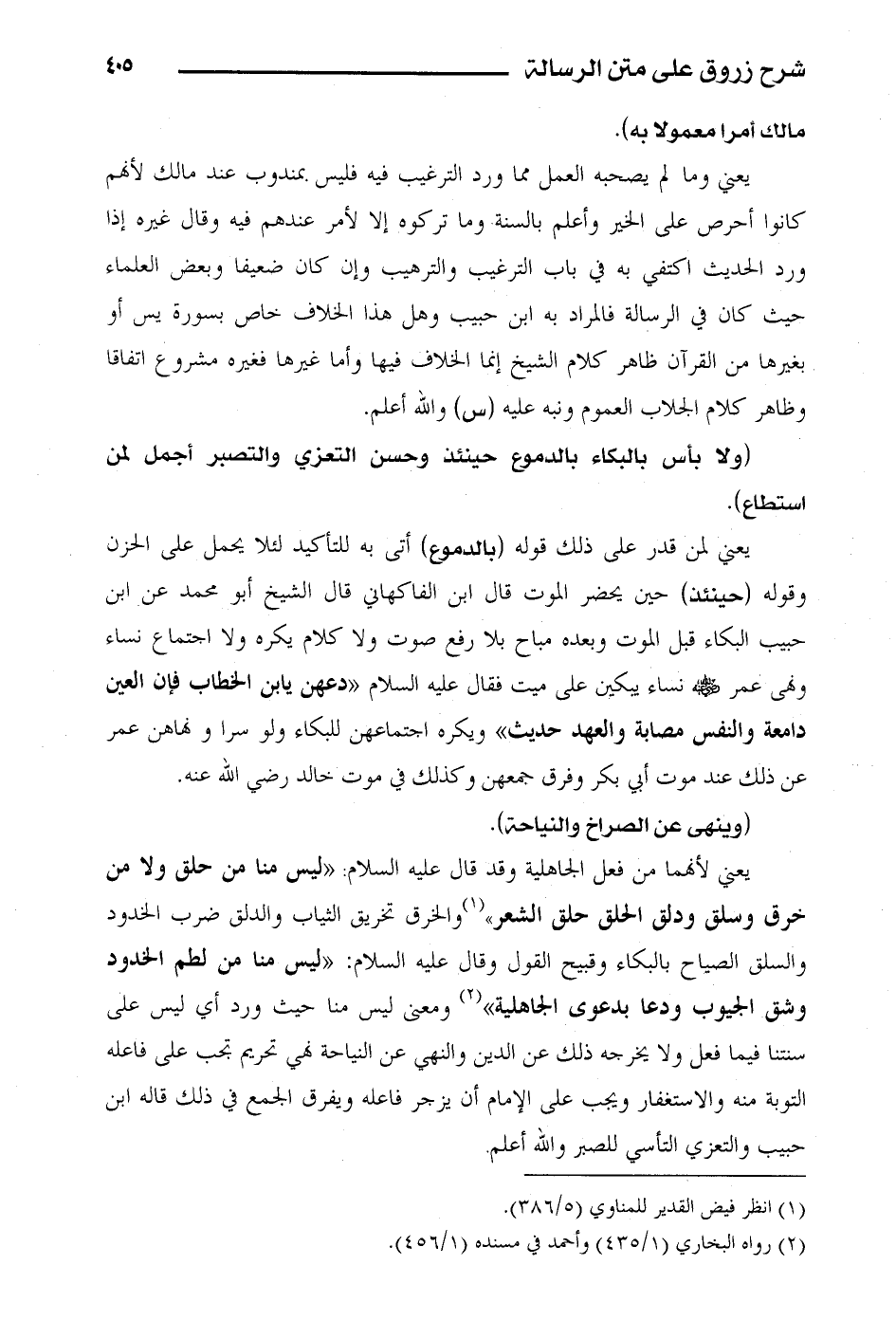 يعني لأنهما من فعل الجاهلية وقد قال عليه السلام «ليس منا من حلق ولا من خرق وسلق ودلق الحلق حلق الشعر» والخرق تخريق الثياب والدلق ضرب الخدود والسلق الصياح بالبكاء وقبيح القول وقال عليه السلام: «ليس منا من لطم الخدود وشق الجيوب ودعا بدعوى الجاهلية» ومعنى ليس منا حيث ورد أي ليس على سنتنا فيما فعل ولا يخرجه ذلك عن الدين والنهي عن النياحة نهي تحريم تجب على فاعله التوبة منه والاستغفار ويجب على الإمام أن يزجر فاعله ويفرق الجمع في ذلك قاله ابن حبيب والتعزي التأسي للصبر والله أعلم.