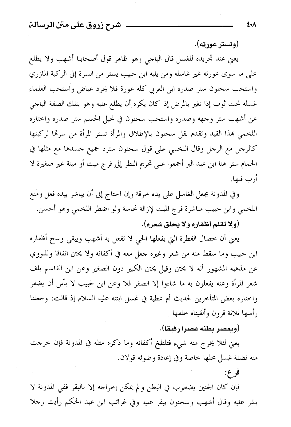 يعني عند تجريده للغسل قال الباجي وهو ظاهر قول أصحابنا أشهب ولا يطلع على ما سوى عورته غير غاسله ومن يليه ابن حبيب يستر من السرة إلى الركبة المازري واستحب سحنون ستر صدره ابن العربي كله عورة فلا يجرد عياض واستحب العلماء غسله تحت ثوب إذا تغير بالمرض إذا كان يكره أن يطلع عليه وهو بتلك الصفة الباجي عن أشهب ستر وجهه وصدره واستحب سحنون في نحيل الجسم ستر صدره واختاره اللخمي بهذا القيد وتقدم نقل سحنون بالإطلاق والمرأة تستر المرأة من سرتها لركبتها كالرجل مع الرجل وقال اللخمي على قول سحنون سترد جميع جسدها مع مثلها في الحمام ستر هنا ابن عبد البر أجمعوا على تحريم النظر إلى فرج ميت أو ميتة غير صغيرة لا أرب فيها.