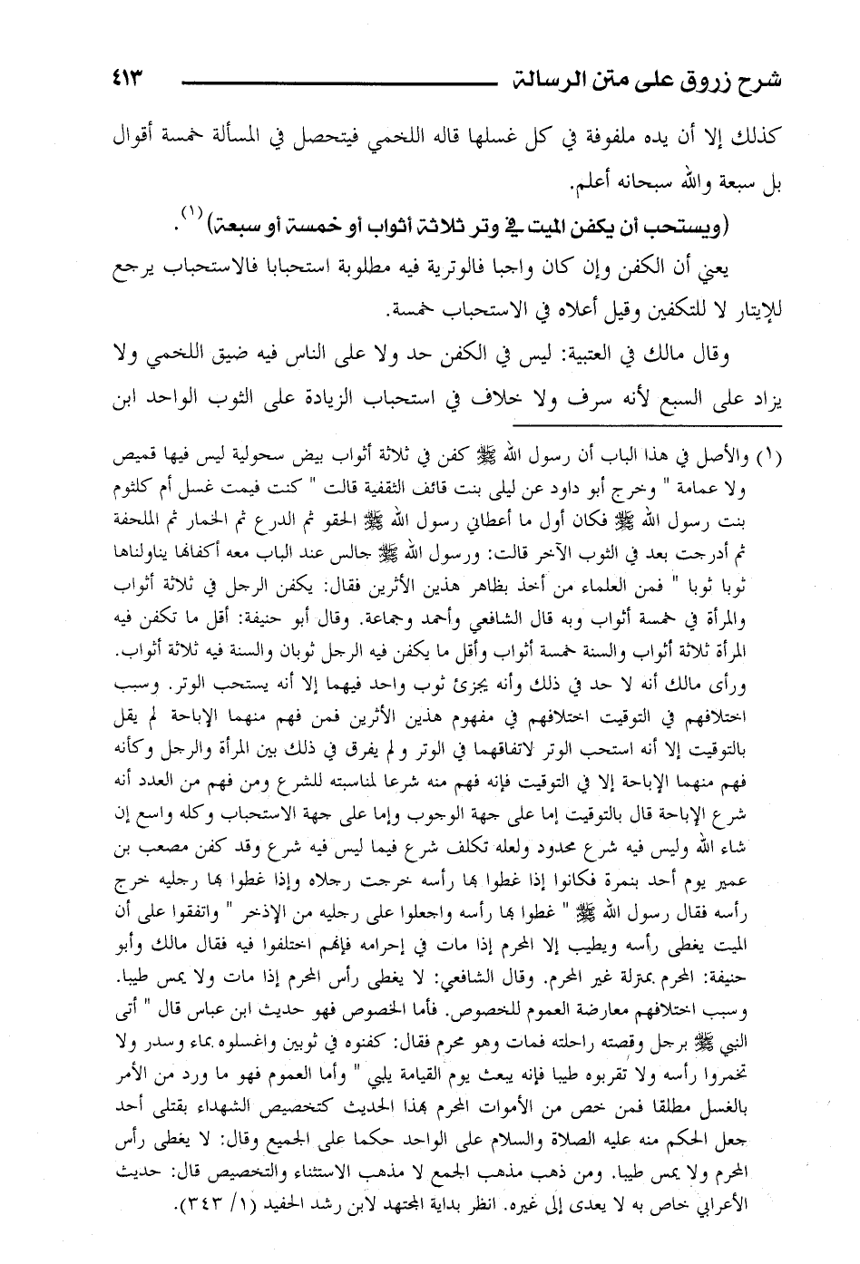 وقال مالك في العتبية: ليس في الكفن حد ولا على الناس فيه ضيق اللخمي ولا يزاد على السبع لأنه سرف ولا خلاف في استحباب الزيادة على الثوب الواحد ابن