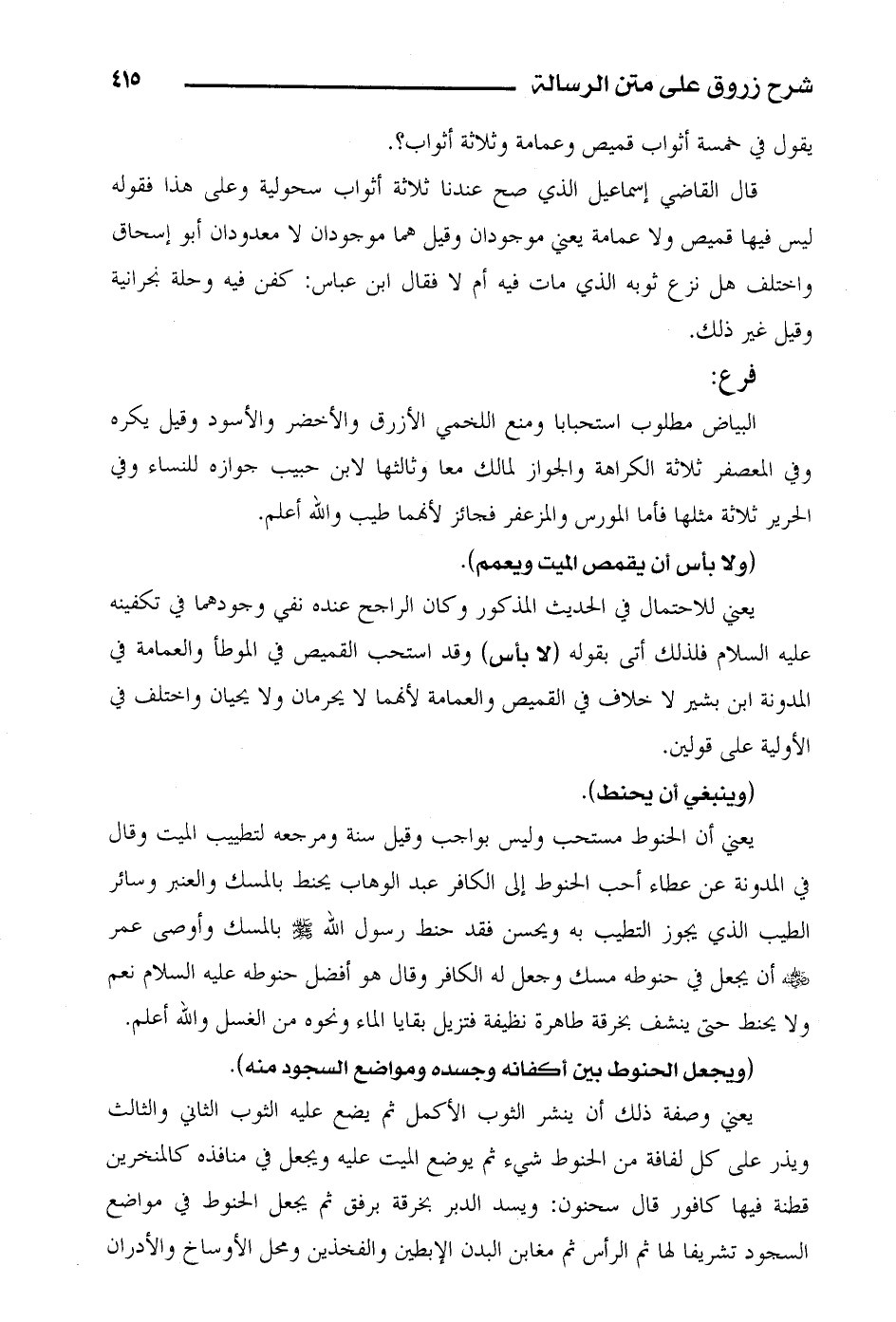 البياض مطلوب استحبابا ومنع اللخمي الأزرق والأخضر والأسود وقيل يكره وفي المعصفر ثلاثة الكراهة والجواز لمالك معا وثالثها لابن حبيب جوازه للنساء وفي الحرير ثلاثة مثلها فأما المورس والمزعفر فجائز لأنهما طيب والله أعلم.