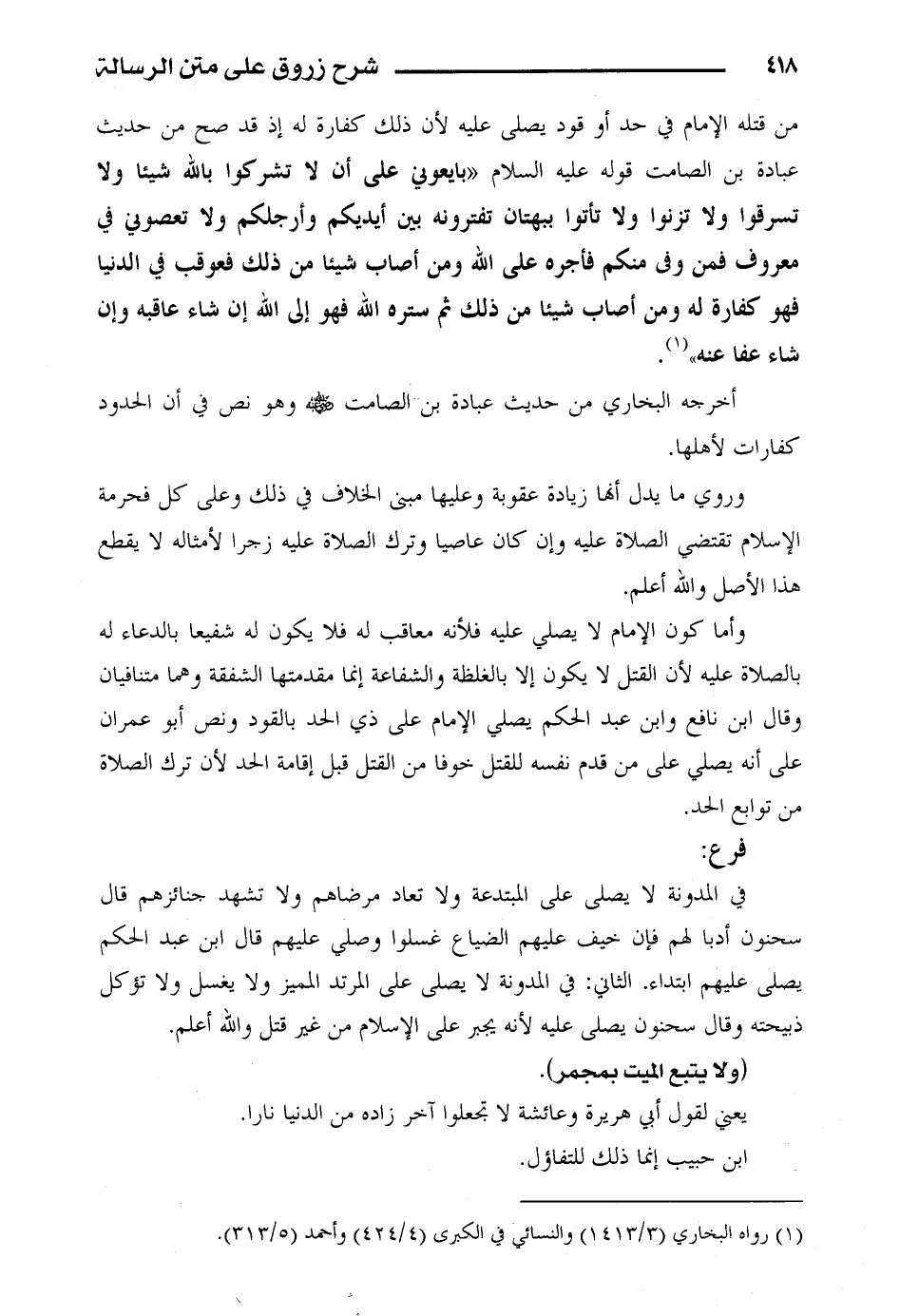 من قتله الإمام في حد أو قود يصلي عليه لأن ذلك كفارة له إذ قد صح من حديث عبادة بن الصامت قوله عليه السلام: «بايعوني على أن لا تشركوا بالله شيئاً ولا تسرقوا ولا تزنوا ولا تأتوا ببهتان تفترونه بين أيديكم وأرجلكم ولا تعصوني في معروف فمن وفي منكم فأجره على الله ومن أصاب شيئاً من ذلك فعوقب في الدنيا فهو كفارة له ومن أصاب شيئاً من ذلك ثم ستره الله فهو إلى الله إن شاء عاقبه وإن شاء عفا عنه».
