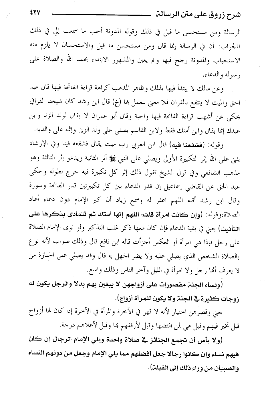 وعن مالك لا يبتدأ فيها بذلك وظاهر المذهب كراهة قراءة الفاتحة فيها قال عبد الحق والميت لا ينتفع بالقرآن فلا معنى للعمل بها (خ) قال ابن رشد كان شيخنا القرافي يحكي عن أشهب قراءة الفاتحة فيها واجبة وقال أبو عمران لا يقال لولد الزنا وابن عبدك إنما يقال وابن أمتك فقط ولابن القاسم يصلى على ولد الزنى وإثمه على والديه.