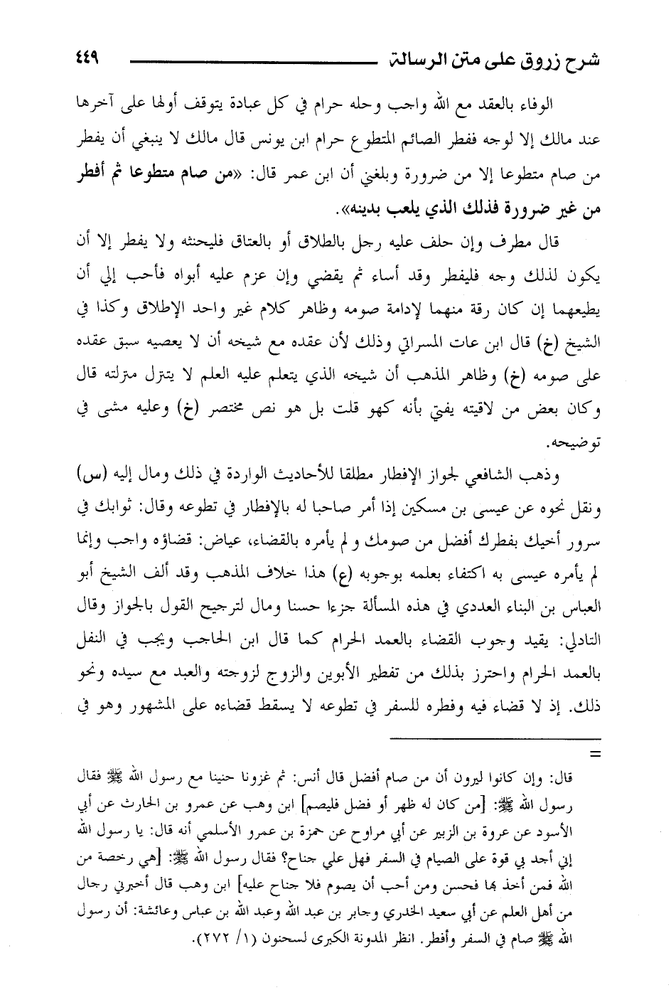الوفاء بالعقد مع الله واجب وحله حرام في كل عبادة يتوقف أولها على آخرها عند مالك إلا لوجه ففطر الصائم المتطوع حرام ابن يونس قال مالك لا ينبغي أن يفطر من صام متطوعا إلا من ضرورة وبلغني أن ابن عمر قال: «من صام متطوعا ثم أفطر من غير ضرورة فذلك الذي يلعب بدينه».