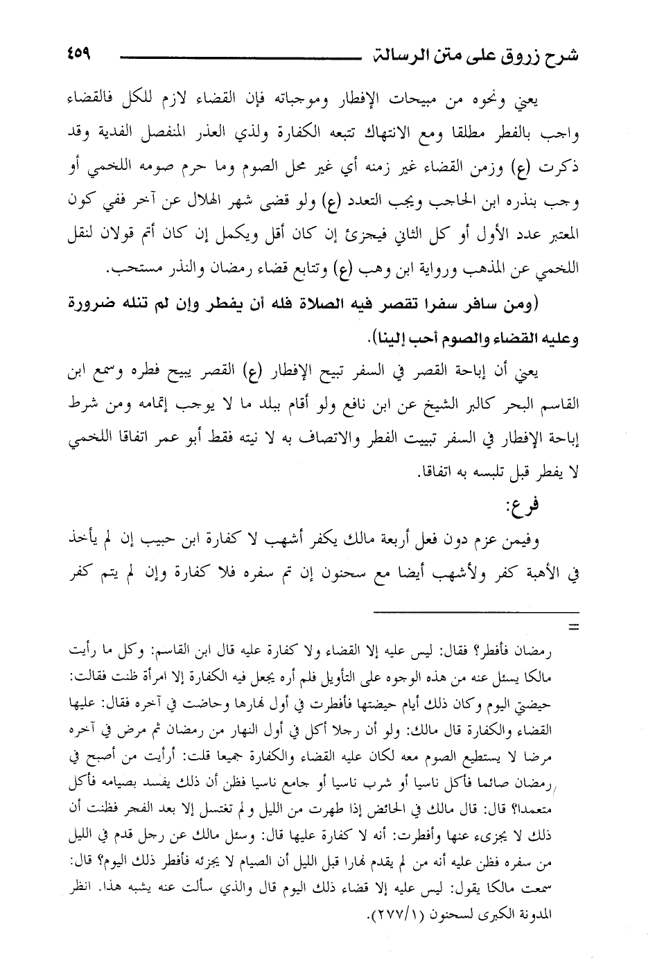 يعني أن إباحة القصر في السفر تبيح الإفطار (ع) القصر يبيح فطره وسمع ابن القاسم البحر كالبر الشيخ عن ابن نافع ولو أقام ببلد ما لا يوجب إتمامه ومن شرط إباحة الإفطار في السفر تبييت الفطر والاتصاف به لا نيته فقط أبو عمر اتفاقا اللخمي لا يفطر قبل تلبسه به اتفاقا.