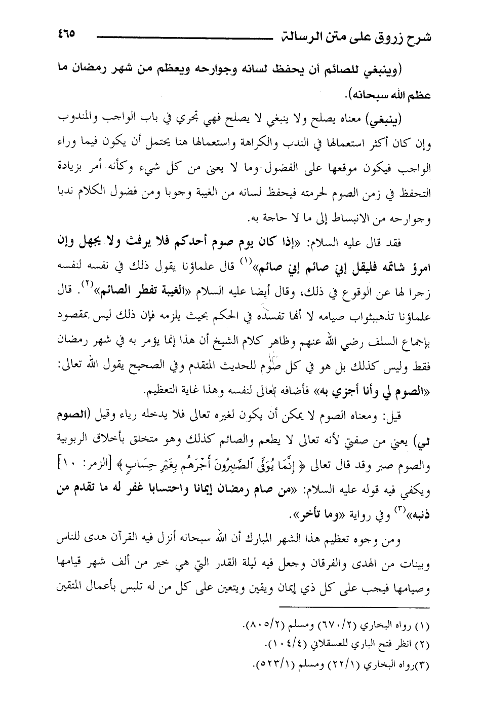 فقد قال عليه السلام: «إذا كان يوم صوم أحدكم فلا يرفث ولا يجهل وإن امرؤ شاتمه فليقل إني صائم إني صائم» قال علماؤنا يقول ذلك في نفسه لنفسه زجرا لها عن الوقوع في ذلك، وقال أيضاً عليه السلام «الغيبة تفطر الصائم». قال علماؤنا تذهب بثواب صيامه لا أنها تفسده في الحكم بحيث يلزمه فإن ذلك ليس بمقصود بإجماع السلف رضي الله عنهم وظاهر كلام الشيخ أن هذا إنما يؤمر به في شهر رمضان فقط وليس كذلك بل هو في كل صوم للحديث المتقدم وفي الصحيح يقول الله تعالى: «الصوم لي وأنا أجزي به» فأضافه تعالى لنفسه وهذا غاية التعظيم.