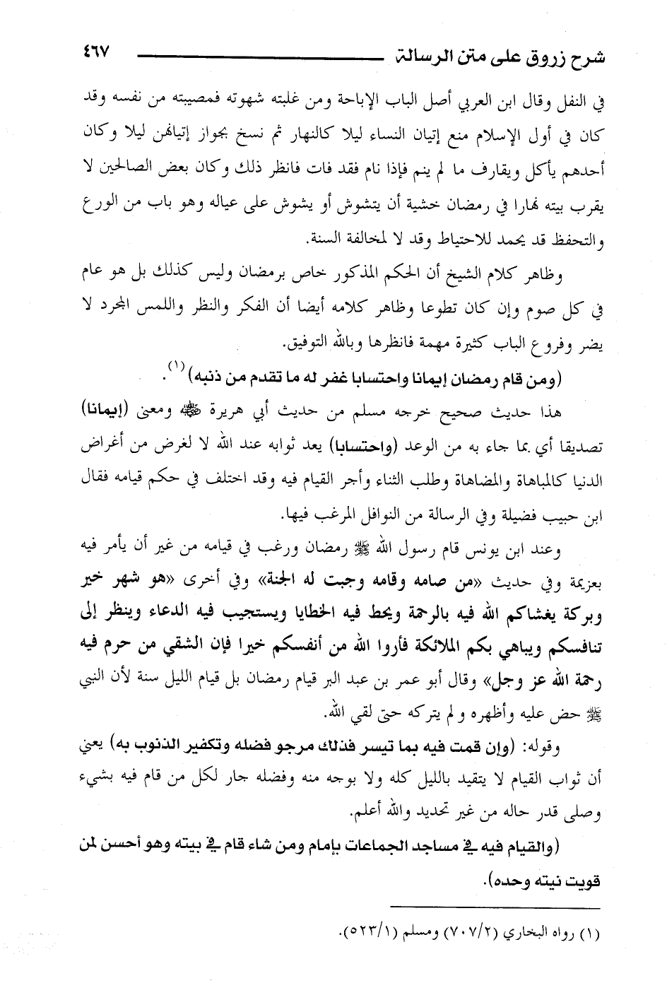 هذا حديث صحيح خرجه مسلم من حديث أبي هريرة رضي الله عنه ومعنى (إيمانا) تصديقا أي بما جاء به من الوعد (واحتسابا) يعد ثوابه عند الله لا لغرض من أغراض الدنيا كالمباهاة والمضاهاة وطلب الثناء وأجر القيام فيه وقد اختلف في حكم قيامه فقال ابن حبيب فضيلة وفي الرسالة من النوافل المرغب فيها.