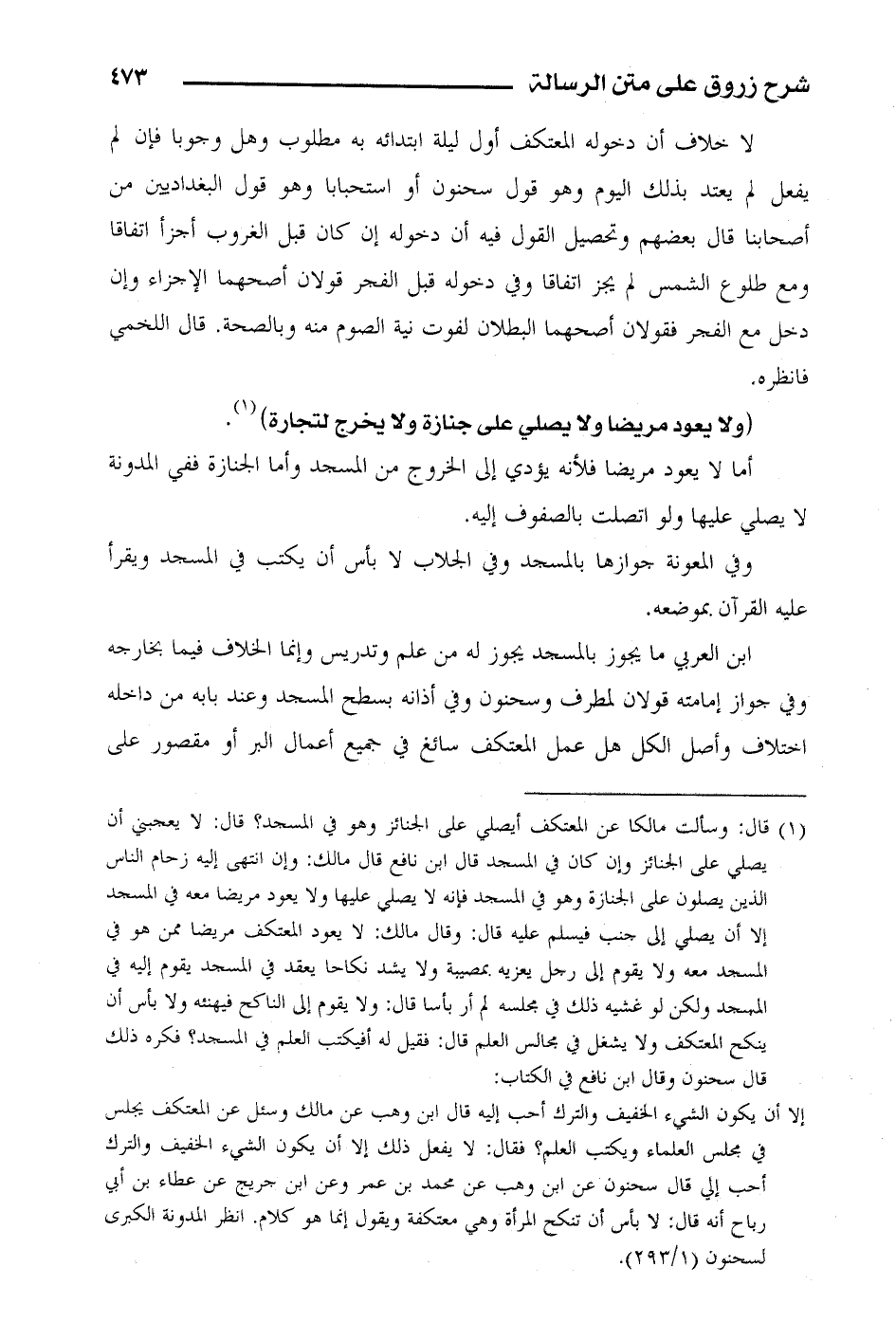 ابن العربي ما يجوز بالمسجد يجوز له من علم وتدريس وإنما الخلاف فيما بخارجه وفي جواز إمامته قولان لمطرف وسحنون وفي أذانه بسطح المسجد وعند بابه من داخله اختلاف وأصل الكل هل عمل المعتكف سائغ في جميع أعمال البر أو مقصور على