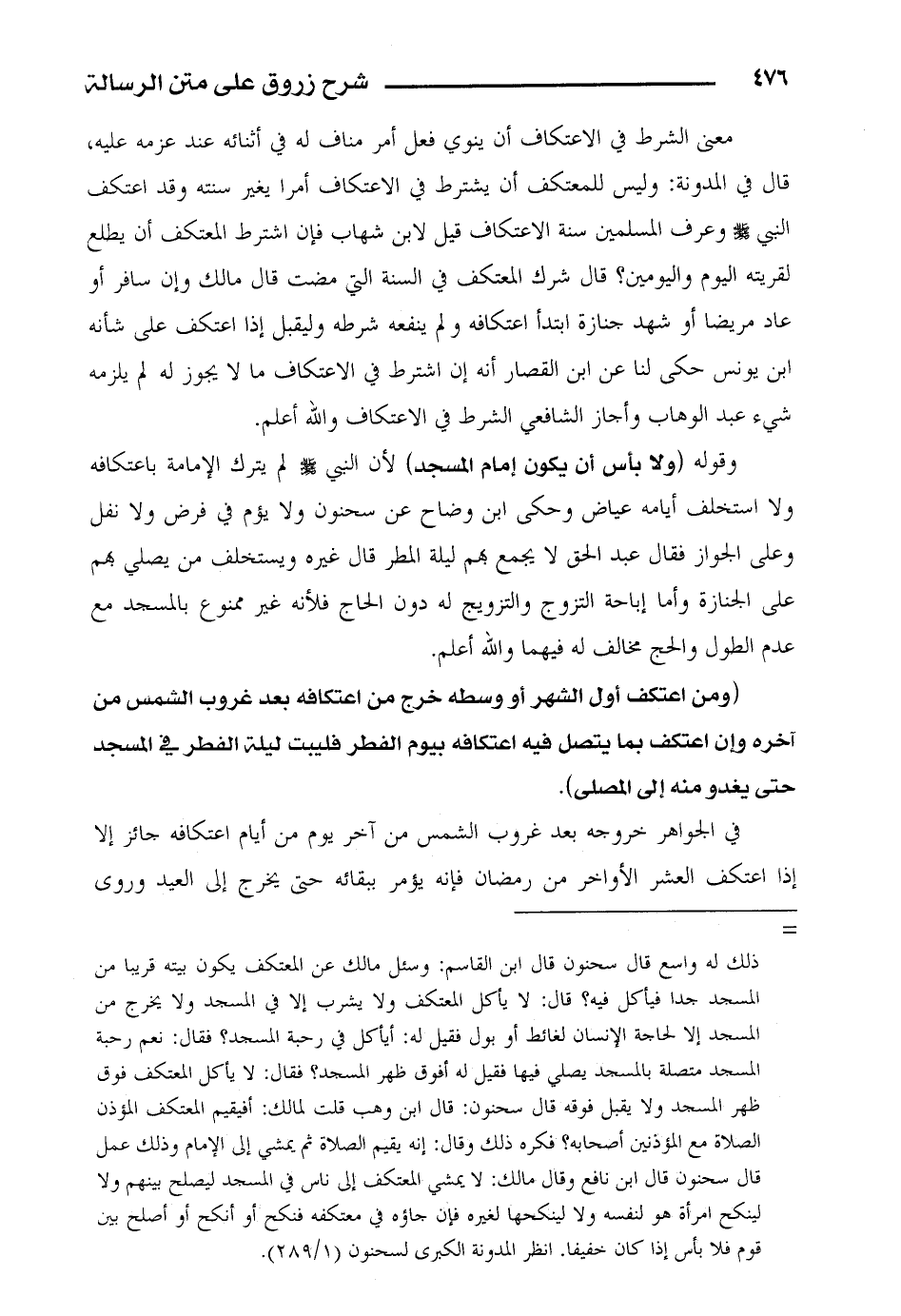 معنى الشرط في الاعتكاف أن ينوي فعل أمر مناف له في أثنائه عند عزمه عليه، قال في المدونة: وليس للمعتكف أن يشترط ف يالاعتكاف أمرا يغير سنته وقد اعتكف النبي صلى الله عليه وسلم وعرف المسلمين سنة الاعتكاف قيل لابن شهاب فإن اشترط المعتكف أن يطلع لقريته اليوم واليومين؟ قال شرك المعتكف في السنة التي مضت قال مالك وإن سافر أو عاد مريضا أو شهد جنازة ابتدأ اعتكافه ولم ينفعه شرطه وليقبل إذا اعتكف على شأنه ابن يونس حكى لنا عن ابن القصار أنه إن اشترط في الاعتكاف ما لا يجوز له لم يلزمه شيء عبد الوهاب وأجاز الشافعي الشرط في الاعتكاف والله أعلم.