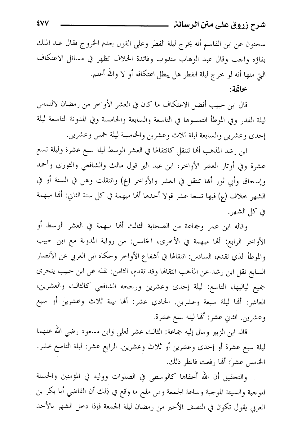 وقاله ابن عمر وجماعة من الصحابة الثالث أنها مبهمة في العشر الوسط أو الأواخر الرابع: أنها مبهمة في الأخرى، الخامس: من رواية المدونة مع ابن حبيب والموطأ الذي تقدم، السادس: انتقالها في أشفاع الأواخر وحكاه ابن العربي عن الأنصار السابع نقل ابن رشد عن المذهب انتقالها وقد تقدم، الثامن: نقله عن ابن حبيب يتحرى جميع لياليها، التاسع: ليلة إحدى وعشرين ورجحه الشافعي كالثالث والعشرين، العاشر: أنها ليلة سبعة وعشرين. الحادي عشر: أنها ليلة ثلاث وعشرين أو سبع وعشرين. الثاني عشر: أنها ليلة سبع عشرة.