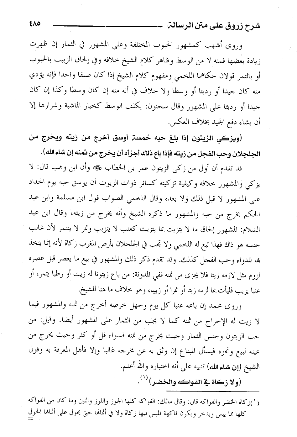 قد تقدم أن أول من زكى الزيتون عمر بن الخطاب رضي الله عنه وأن ابن وهب قال: لا يزكي والمشهور خلافه وكيفية تزكيته كسائر ذوات الزيوت أن يوسق حبه يوم الجداد على المشهور لا قبل ذلك ولا بعده وقال اللخمي الصواب قول ابن مسلمة وابن عبد الحكم يخرج من حبه والمشهور ما ذكره الشيخ وأنه يخرج من زيته، وقال ابن عبد السلام: المشهور إلحاق ما لا يتزيت بما يتزيت كعنب لا يتزبب وتمر لا يتتمر لأن غالب جنسه هو ذاك فهذا تبع له اللخمي ولا تجب في الجلجلان بأرض المغرب زكاة لأنه إنما يتخذ بها للدواء وحب الفجل كذلك. وقد تقدم ذكر ذلك والمشهور في بيع ما يعصر قبل عصره لزوم مثل لازمه زيتا فلا يجزي من ثمنه ففي المدونة: من باع زيتونا له زيت أو رطبا يتمر، أو عنبا يزبب فليأت بما لزمه زيتا أو تمرا أو زبيبا، وهو خلاف ما هنا للشيخ.