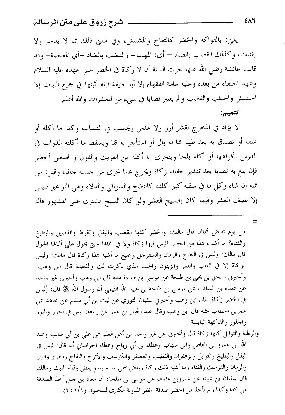 يعني: بالفواكه والخضر كالتفاح والمشمش، وفي معنى ذلك مما لا يدخر ولا يقتات، وكذلك اىلقصب بالصاد – أي: المهملة – والقضب بالضاد – أي المعجمة – وقد قالت عائشة رضي الله عنها جرت السنة أن لا زكاة في الخضر على عهده عليه السلام وعهد الخلفاء من بعده وعليه عامة الفقهاء إلا أبا حنيفة فإنه أثبتها في جميع النبات إلا الحشيش والحطب والقصب ولم يعتبر نصابا في شيء من المعشرات والله أعلم.
