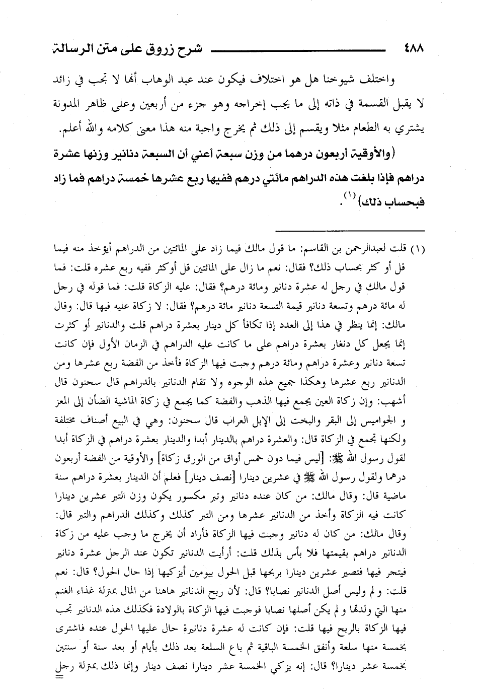 (والأوقية أربعون درهما من وزن سبعة أعني أن السبعة دنانير وزنها عشرة دراهم فإذا بلغت هذه الدراهم مائتي درهم ففيها ربع عشرها خمسة دراهم فما زاد فبحساب ذلك).