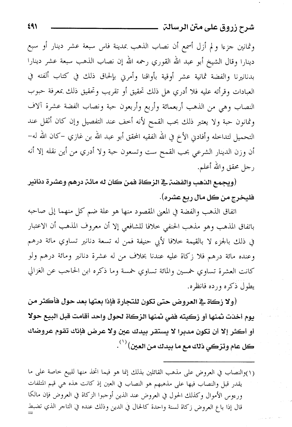 وثمانين جزءا ولم أزل أسمع أن نصاب الذهب بمدينة فاس سبعة عشر دينار أو سبع دينارا وقال الشيخ أبو عبد الله القوري رحمه الله إن نصاب الذهب سبعة عشر دينارا بدنانيرنا والفضة ثمانية عشر أوقية بأواقنا وأمرني بإلحاق ذلك في كتاب ألفته في العبادات وقرأته عليه فلا أدري هل ذلك تحقيق أو تقريب وتحقيق ذلك بمعرفة حبوب النصاب وهي من الذهب أربعمائة وأربع وأربعون حبة ونصاب الفضة عشرة آلاف وثمانون حبة ولا يعتبر ذلك بحب القمح لأنه أخف عند التفضيل وإن كان أثقل عند التحميل لتداخله وأفادني الأخ في الله الفقيه المحقق أبو عبد الله بن غازي - كان الله له - أن وزن الدينار الشرعي بحب القمح ست وتسعون حبة ولا أدري من أين نقله إلا أنه رجل محقق والله أعلم.