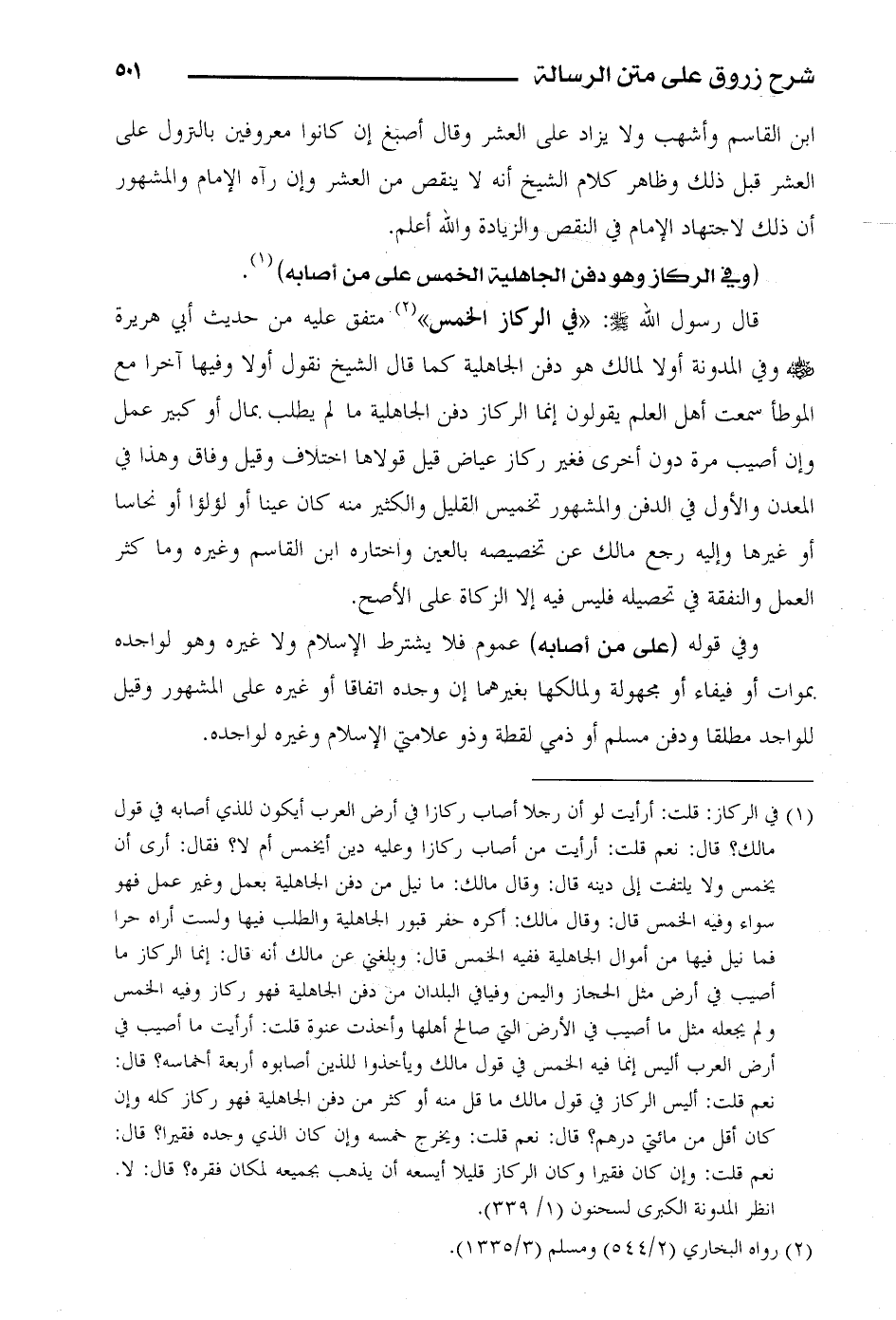 قال رسول الله صلى الله عليه وسلم: «في الركاز الخمس» متفق عليه من حديث أبي هريرة رضي الله عنه وفي المدونة أولا لمالك هو دفن الجاهلية كما قال الشيخ نقول أولا وفيها آخرا مع الموطأ سمعت أهل العلم يقولون إنما الركاز دفن الجاهلية ما لم يطلب بمال أو كبير عمل وإن أصيب مرة دون أخرى فغير ركاز عياض قيل قولاها اختلاف وقيل وفاق وهذا في المعدن والأول في الدفن والمشهور تخميس القليل والكثير منه كان عينا أو لؤلؤا أو نحاسا أو غيرها إليه رجع مالك عن تخصيصه بالعين واختاره ابن القاسم وغيره وما كثر العمل والنفقة في تحصيله فليس فيه إلا الزكاة على الأصح.