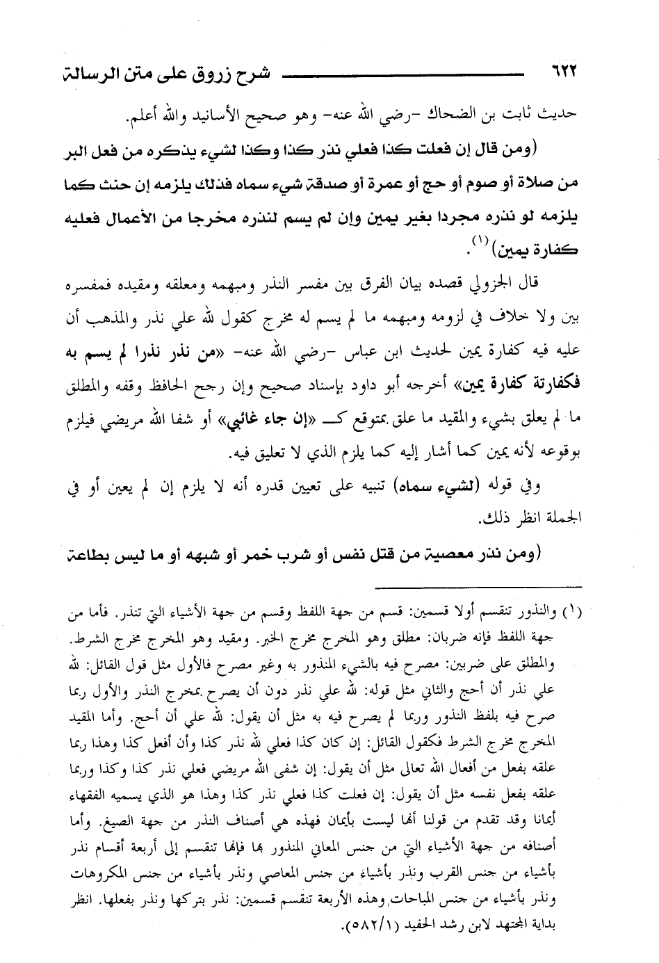 قال الجزولي قصده بيان الفرق بين مفسر النذر ومبهمه ومعلقه ومقيده فمفسره بين ولا خلاف في لزومه ومبهمه ما لم يسم له مخرج كقول لله علي نذر والمذهب أن عليه فيه كفارة يمين لحديث ابن عباس – رضي الله عنه – " من نذر نذا لم يسم به فكفارته كفارة يمين" أخرج أبو داود بإسناد صحيح وإن رجح الحافظ وقفه والمطلق ما لم يعلق بشيء والمقيد ما علق بمتوقع كـ " إن جاء غائبي" أو شفا الله مريضي فيلزم بوقوعه لأنه يمين كما أشار إليه كما يلزم الذي لا تعليق فيه.
