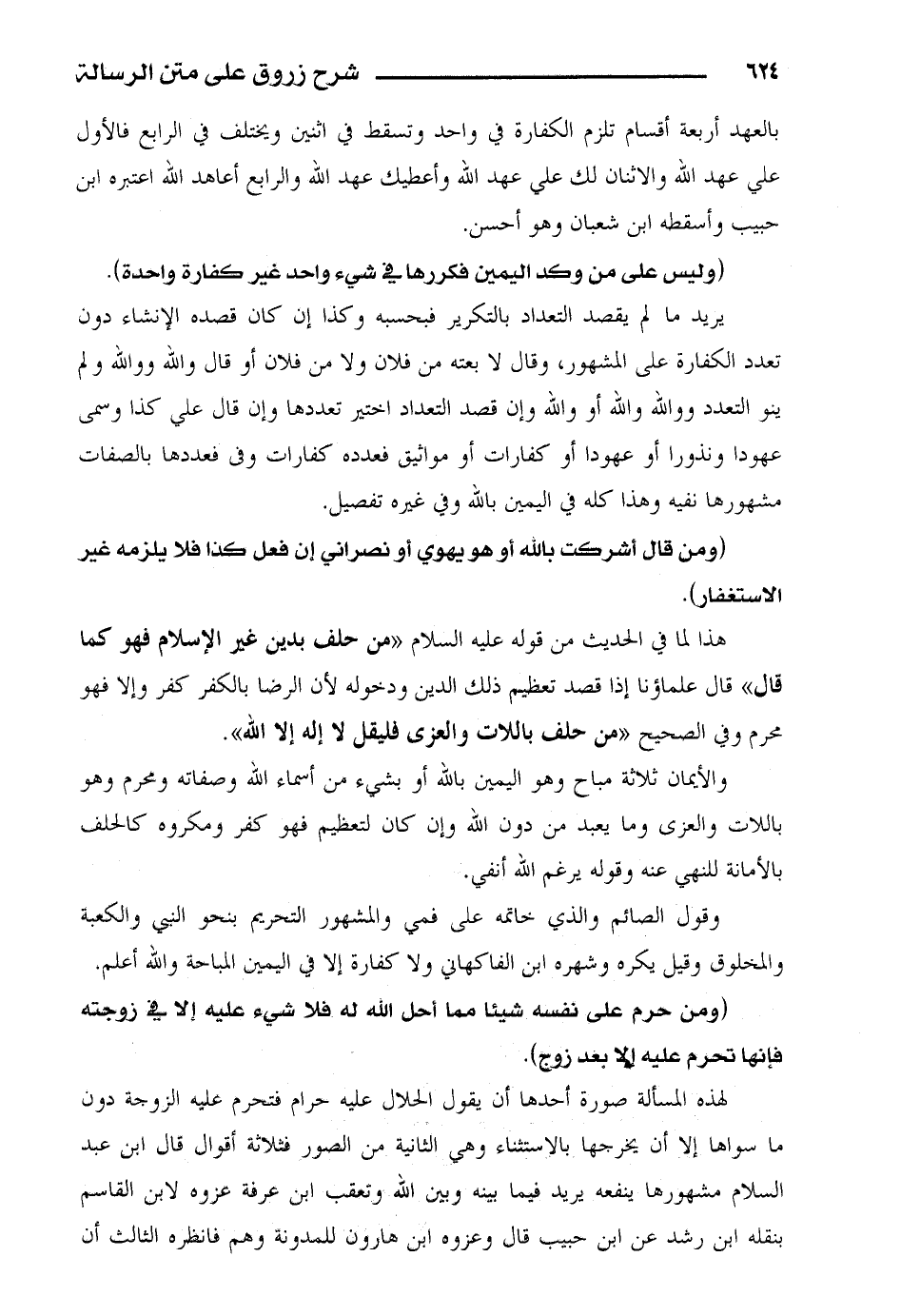 وقول الصائم والذي خاتمه على فمي والمشهور التحريم بنحو النبي والكعبة والمخلوق وقيل يكره وشهره ابن الفاكهاني ولا كفارة إلا في اليمين المباحة والله أعلم.