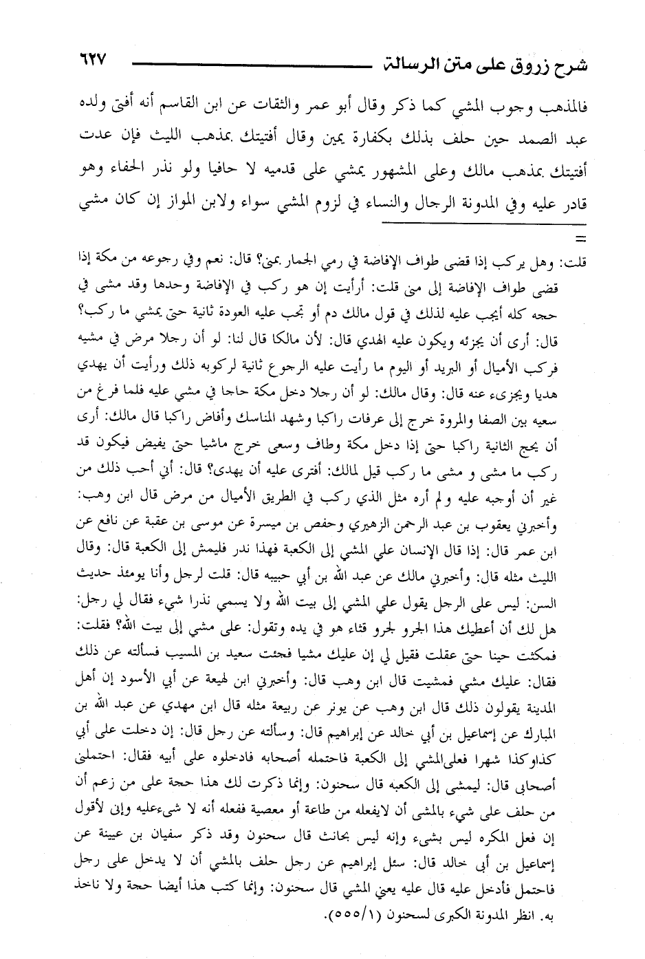 فالمذهب وجوب المشي كما ذكر وقال أبو عمر والثقات عن ابن القاسم أنه أفتى ولده عبد الصمد حين حلف بذلك بكفارة يمين وقال أفتيك بمذهب الليث فإن عدت أفتيك بمذهب مالك وعلى المشهور يمشي على قدميه لا حافيا ولو نذر الحفاء وهو قادر عليه وفي المدونة الرجال والنساء في لزوم المشي سواء ولابن المواز إن كان مشي