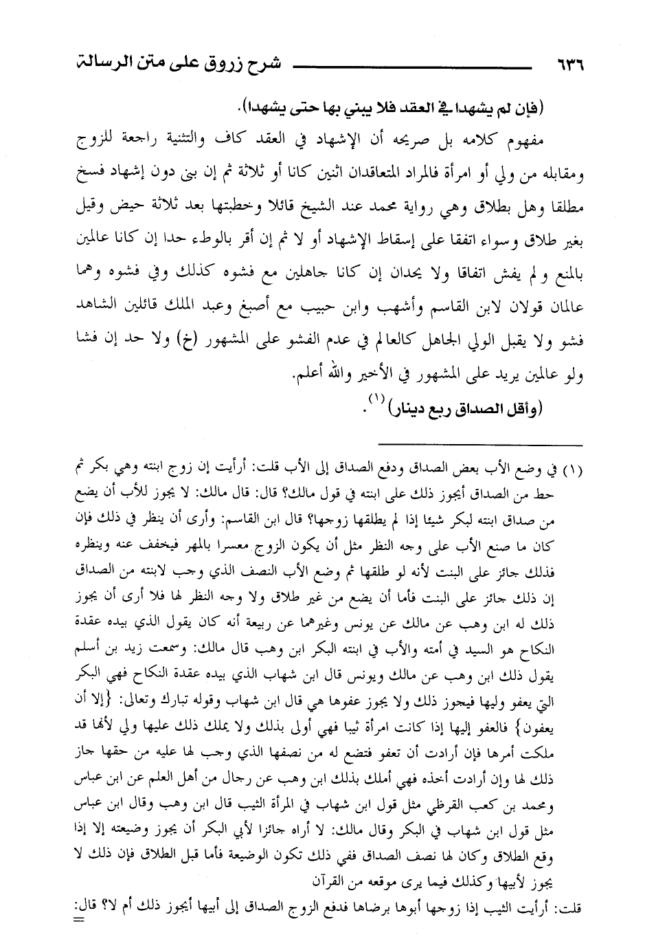 مفهوم كلامه بل صريحه أن الإشهاد في العقد كاف والتثنية راجعبة للزوج ومقابلة من ولي أو امرأة فالمراد المتعاقدان اثنين كانا أو ثلاثة ثم إن بنى دون إشهاد فسخ مطلقا وهل بطلاق وهي رواية محمد عند الشيخ قائلا وخطبتها بعد ثلاثة حيض وقيل بغير طلاق وسواء اتفقا على إسقاط الإشهاد أو لاث ثم إن أقر بالوطء حدا إن كانا عالمين بالمنع ولم يفش اتفاقا ولا يحدان إن كانا جاهلين مع فشوه كذلك وفي فشوه وهما عالمان قولان لابن القاسم وأشهب وابن حبيب مع أصبغ وعبد الملك قائلين الشاهد فشو ولا يقبل الولي الجاهل كالعالم في عدم الفشو على المشهور (خ) ولا حد إن فشا ولو عالمين يريد على المشهور في الأخير والله أعلم.