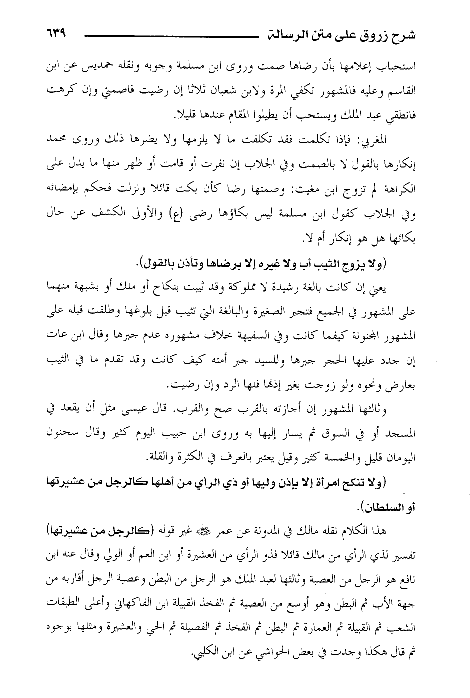 (ولا تنكح المرأة إلا بإذن وليها أو ذي الرأي من أهلها كالرجل من عشيرتها أو السلطان).