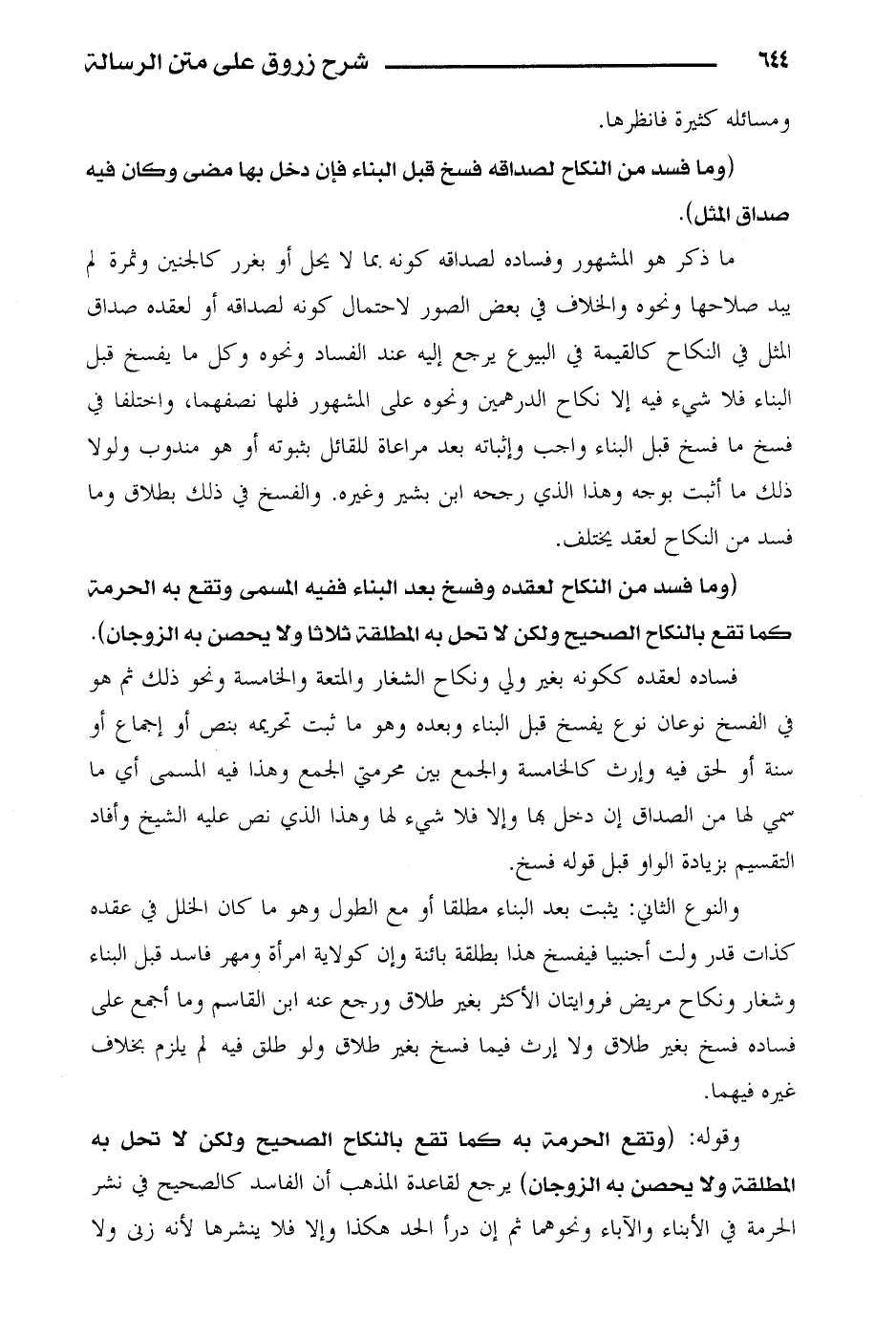 والنوع الثاني: يثبت بعد البناء مطلقا أو مع الطول وهو ما كان الخلل في عقده كذات قدر ولت أجنبيا فيفسخ هذا بطلقة بائنة وإن كولاية امرأة ومهر فاسد قبل البناء وشغار ونكاح مريض فروايتان الأكثر بغير طلاق ورجع عنه ابن القاسم وما أجمع على فساده فسخ بغير طلاق ولا غرث فيما فسخ بغير طلاق ولو طلق فيه لم يلزم بخلاف غيره فيهما.