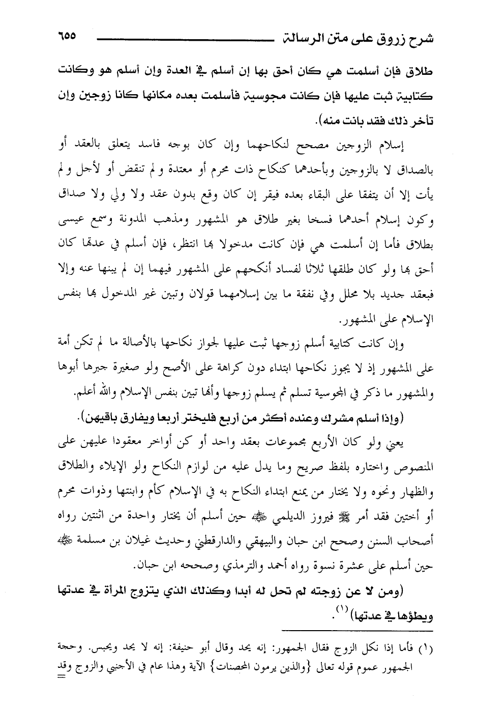 إسلام الزوجين مصحح لنكاحهما وإن كان بوجه فاسد يتعلق بالعقد أو بالصداق لا بالزوجين وبأحدهما كنكاح ذات محرم أو معتدة ولم تنقض أو لأجل ولم يأت إلا أن يتفقا على البقاء بعده فيقر إن كان وقع بدون عقد ولا ولي ولا صداق وكون إسلام أحدهما فسخا بغير طلاق هو المشهور ومذهب المدونة وسمع عيسى بطلاق فأما إن أسلمت هي فإن كانت مدخولا بها انتظر، فإن أسلم في عدتها كان أحق بها ولو كان طلقها ثلاثا لفساد أنكحهم على المشهور فيهما إن لم يبنها عنه وإلا فبعقد جديد بلا محلل وفي نفقة ما بين إسلامهما قولان وتبين غير المدخول بها بنفس الإسلام على المشهور.