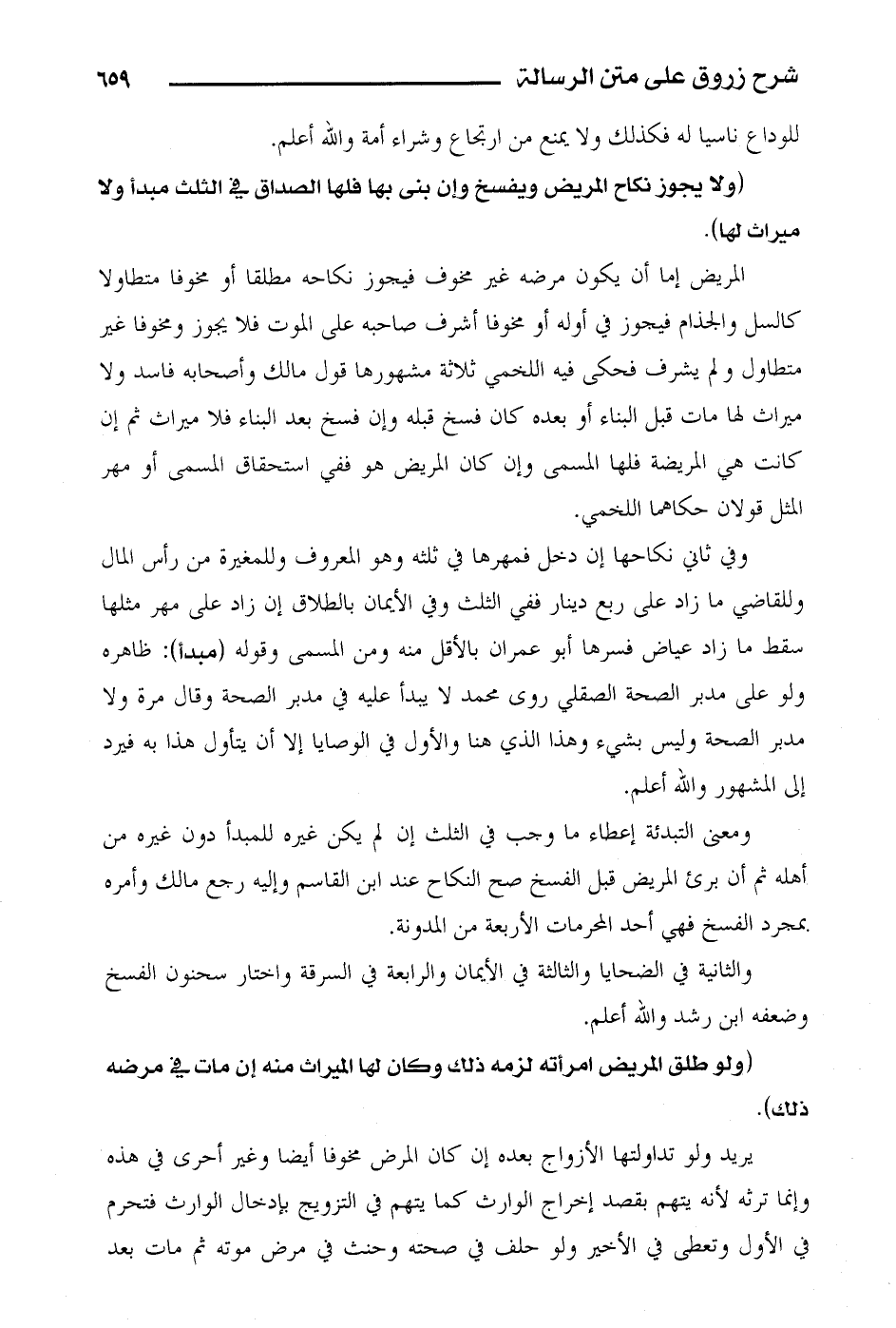 المريض إما أن يكون مرضه غير مخوف فيجوز نكاه مطلقا أو مخوفا متطاولا كالسل والجذام فيجوز في أوله أو مخوفا أشرف صاحبه على الموت فلا يجوز ومخوفا غير متطاول ولم يشرف فحكى فيه اللخمي ثلاثة مشهورها قول مالك وأصحابه فاسد ولا ميراث لها مات قبل البناء أو بعده كان فسخ قبله وإن فسخ بعد البناء فلا ميراث ثم إن كانت هي المريضة فلها المسمى وإن كان المريض هو ففي استحقاق المسمى أو مهر المثل قولان حكاهما اللخمي.