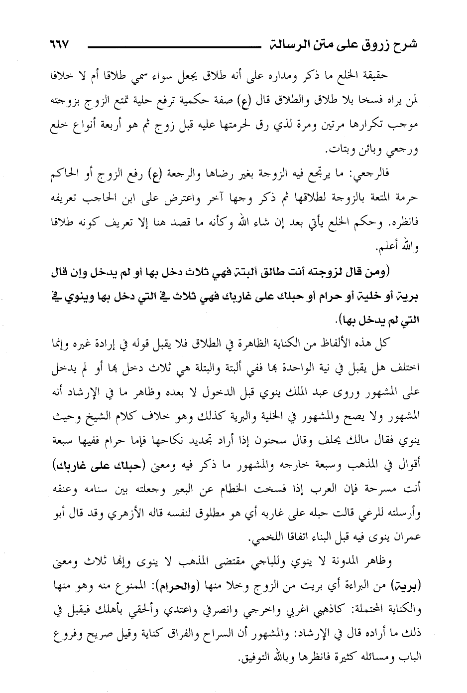 وظاهر المدونة لا ينوي وللباجي مقتضى المذهب لا ينوى وإنها ثلاثة ومعنى (برية) من البراءة أي بريت من الزوج وخلا منها (والحرام): الممنوع منه وهو منها والكناية المحتملة: كاذهبي اغربي واخرجي وانصرفي واعتدي وألحقي بأهلك فيقبل في ذلك ما أراده قال في الإرشاد: والمشهور أن السراح والفراق كناية وقيل صريح وفروع الباب ومسائله كثيرة فانظرها وبالله التوفيق.