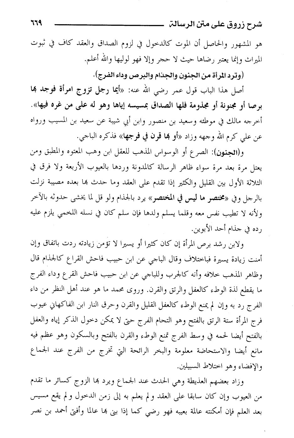 و (الجنون): الصرع أو الوسواس المذهب للعقل ابن وهب المعتوه والمطبق ومن يعتل مرة بعد مرة سواء ظاهر الرسالة كالمدونة وردها بالعيوب الأربعة ولا فرق في الثلاثة الأول بين القليل والكثير إذا تقدم والكثير إذا تقدم على العقد وما حدث بها بعده مصيبة نزلت بالرجل وفي " مختصر ما ليس في المختصر" يرد بالجذام ولو قال لما يخشى حدوثه بالآخر ولأنه لا تطيب نفس معه وقلما يسلم ولدها فإن سلم كان في نسله اللخمي يلزم عليه رده في جذام أحد الأبوين.