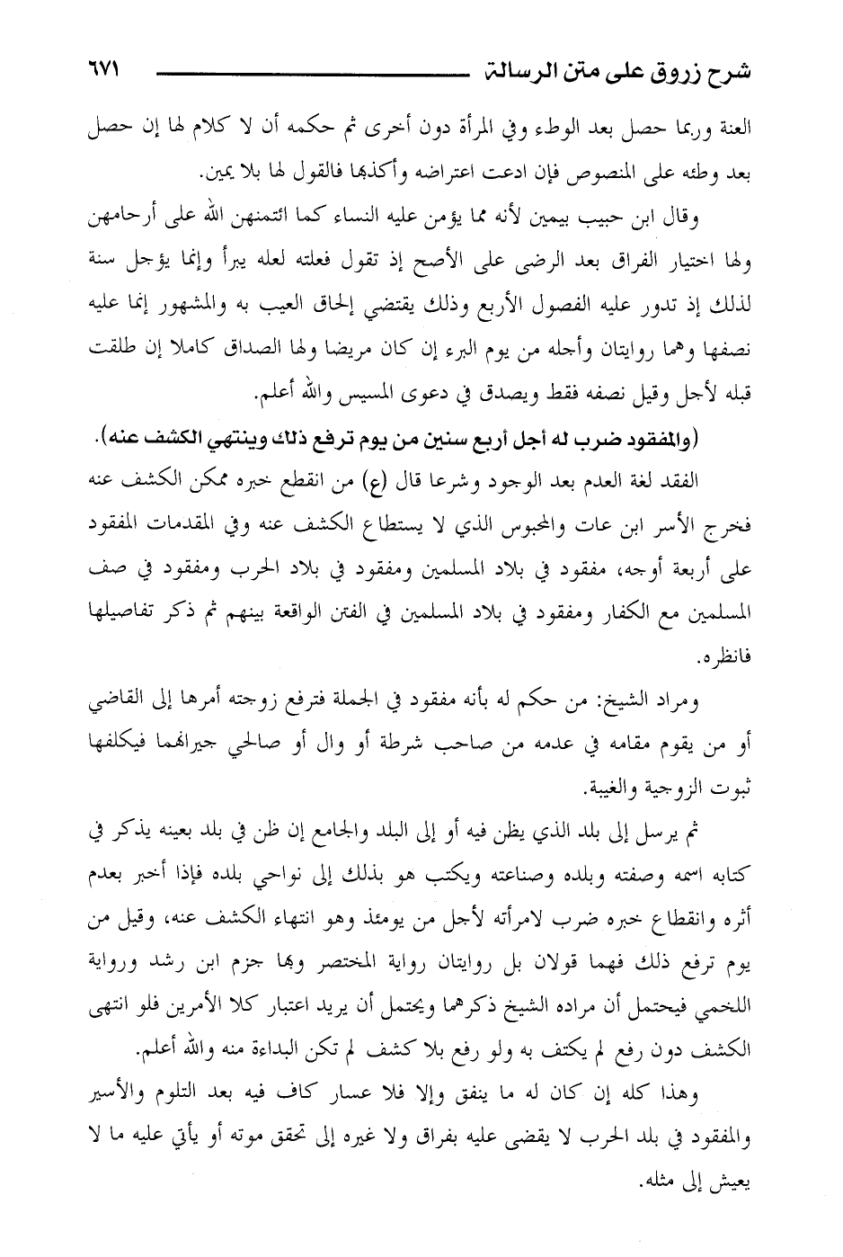 الفقد لغة العدم بعد الوجود وشرعا قال (ع) من انقطع خبره ممكن الكشف عنه فخرج الأسر ابن عات والمحبوس الذي لا يستطاع الكشف عنه وفي المقدمات المفقود على أربعة أوجه، مفقود في بلاد المسلمين ومفقود في بلاد الحرب ومفقود في صف المسلمين مع الكفار ومفقود في بلاد المسلمين في الفتن الواقعة بينهم ثم ذكر تفاصيلها فانظره.