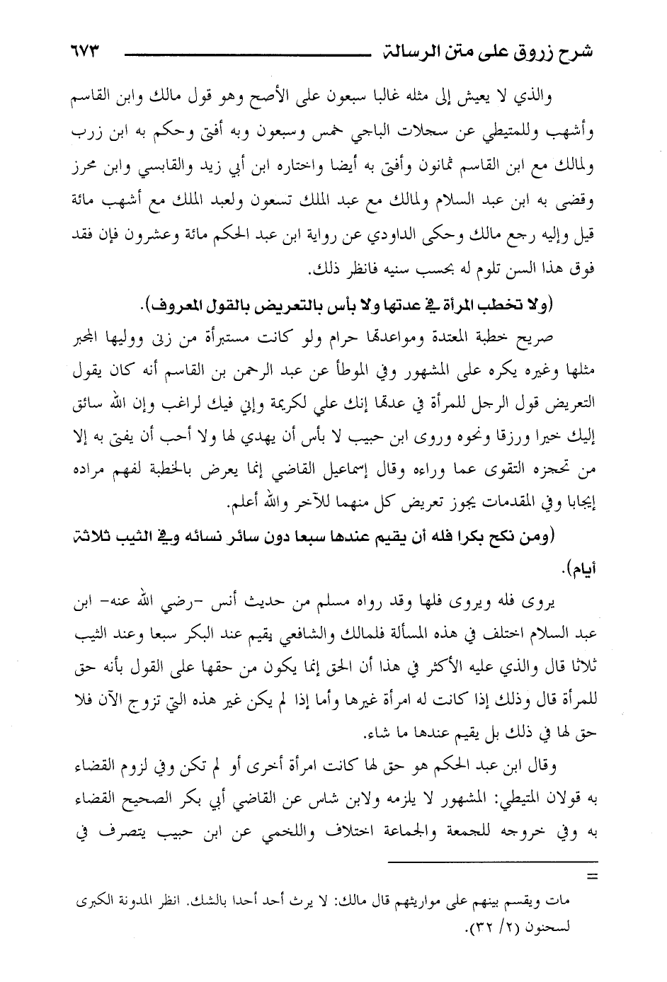 يروى فله ويروى فلها وقد رواه مسلم من حديث أنس- رضي الله عنه – ابن عبد السلام اختلف في هذه المسألة فلمالك والشافعي يقيم عند البكر سبعا وعند الثيب ثلاثا قال والذي عليه الأكثر في هذا أن الحق إنما يكون منحقها على القول بأنه حق للمرأة قال وذلك إذا كانت له امرأة وغيرها وأما إذا لم يكن غير هذه التي تزوج الآن فلا حق لها في ذلك بل يقيم عندها ما شاء.