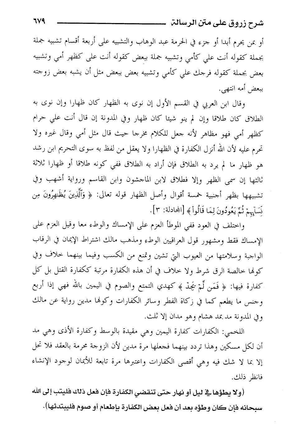 واختلف في العود ففي الموطأ العزم على الإمساك والوطء معا وقيل العزم على الإمساك فقط ومشهور قول العراقيين الوطء ومذهب مالك اشتراط الإيمان في الرقاب الواجبة وسلامتها من العيوب التي تشين وتمنع من الكسب وفيما بينهما خلاف وفي كونها خالصة الرق شرط ولا خلاف في أن هذه الكفارة مرتبة ككفارة القتل بل كل كفارة فيها: {فمن لم يجد} كهدي التمتع والصوم في اليمين بالله فهي إذا أربع وجنس ما يطعم كما في زكاة الفطر وسائر الكفارات وكونها مدين رواية عن مالك وفي المدونة مد بمد هشام وهو مدان إلا ثلث.
