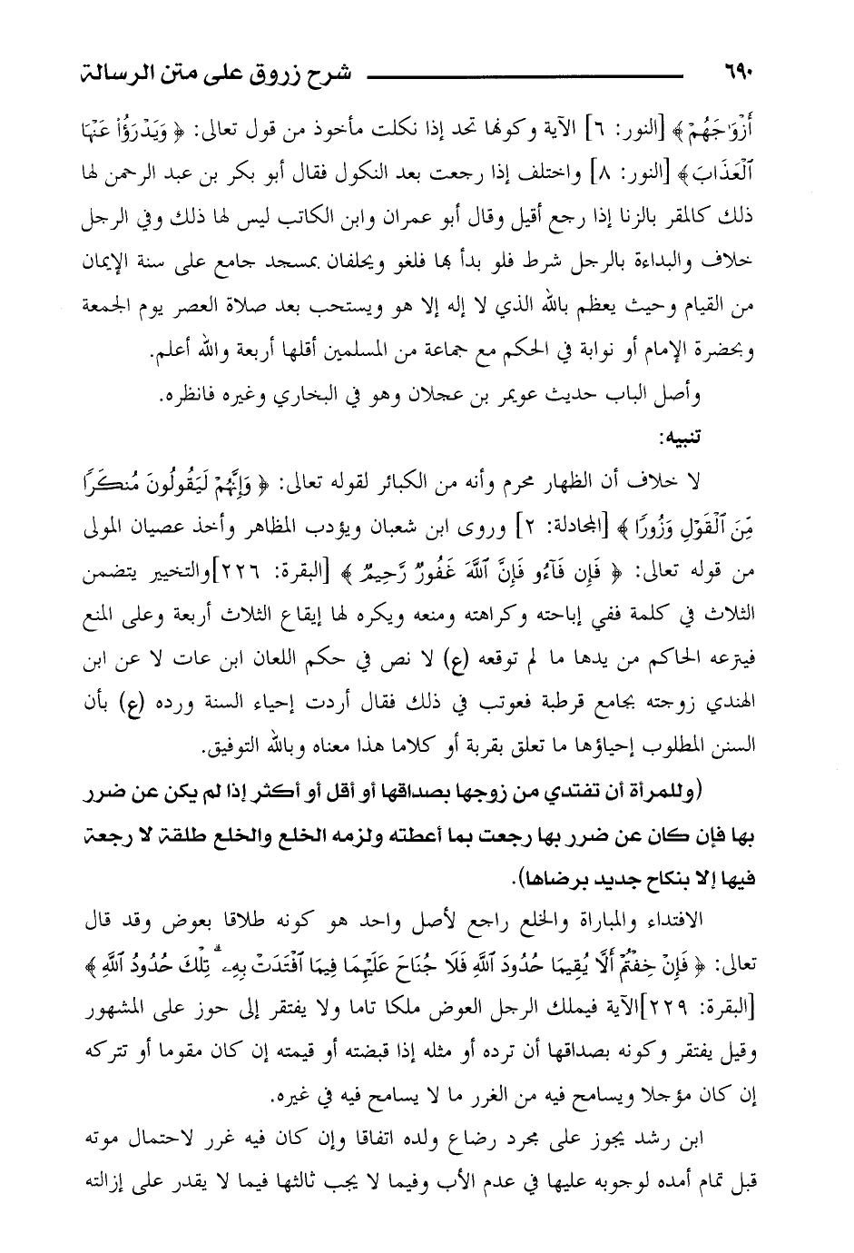 لا خلاف أن الظهار محرم وأنه من الكبائر لقوله تعالى: {وإنهم ليقولون منكراً من القول وزوراً} [المجادلة: 2] وروى ابن شعبان ويؤدب المظاهر وأخذ عصيان المولى من قوله تعالى: {فإن فاءو فإن الله غفور رحيم} [البقرة: 226] والتخيير يتضمن الثلاث في كلمته ففي إباحته وكراهته ومنعه ويكره لها إيقاع الثلاث أربعة وعلى المنع فينزعه الحاكم من يدها ما لم توقع (ع) لا نص في حكم اللعان ابن عات لا عن ابن الهندي زوجته بجامع قرطبة فعوتب في ذلك فقال أردت إحياء السنة ورده (ع) بأن السنن المطلوب إحياؤها ما تعلق بقربة أو كلاما هذا معناه وبالله التوفيق.