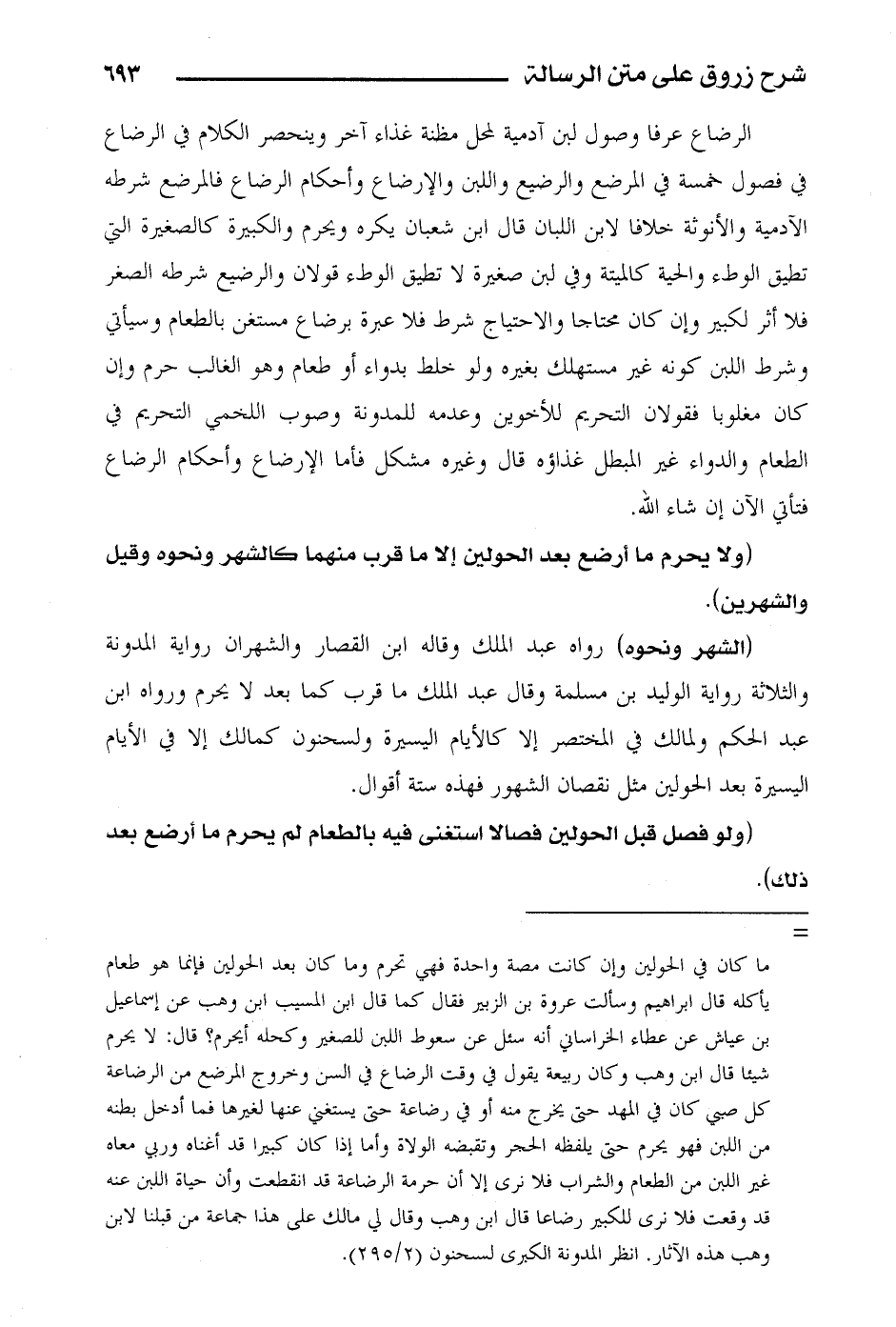 الرضاع عرفا وصول لبن آدمية لمحل مظنة غذاء آخر وينحصر الكلام في الرضاع في فصول خمسة في المرضع والرضيع واللبن والإرضاع وأحكام الرضاع فالمرضع شرطه الآدمية والأنوثة خلافا لابن اللبان قال ابن شعبان يكره ويحرم الكبيرة كالصغيرة التي تطيق الوطء والحية كالميتة وفي لبن صغيرة لا تطيق الوطء قولان والرضيع شرطه الصغر فلا أثر لكبير وإن كان محتاجا والاحتياج شرط فلا عبرة برضاع مستغن بالطعام وسيأتي وشرط اللبن كونه غير مستهلك بغيره ولو خلط بدواء أو طعام وهو الغالب حرم وإن كان مغلوبا فقولان التحريم للأخوين وعدمه للمدونة وصوب اللخمي التحريم في الطعام والدواء غير المبطل غذاؤه قال وغيره مشكل فأما الإرضاع وأحكام الرضاع فتأتي الآن إن شاء الله.