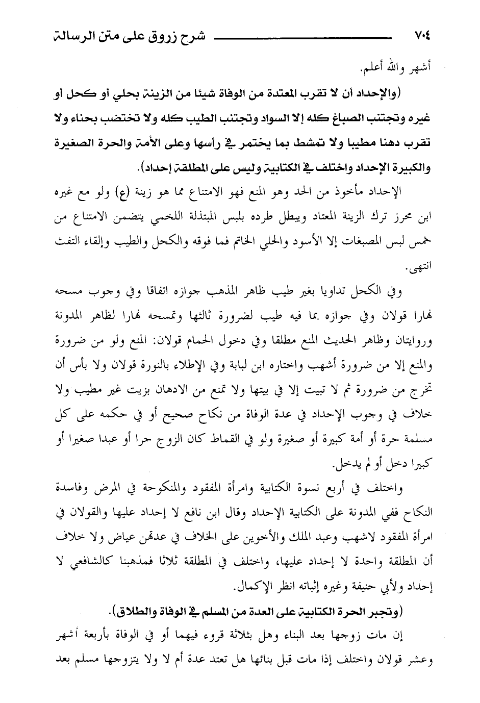 الإحداد مأخوذ من الحد وهو المنع فهو الامتناع مما هو زينة (ع) ولو مع غيره ابن محرز ترك الزينة المعتاد ويبطل طرده بلبس المبتذلة اللخمي يتضمن الامتناع من خمس لبس المصبغات إلى الأسود والحلي الخاتم فما فوقه والكحل والطيب وإلقاء التفث انتهى.