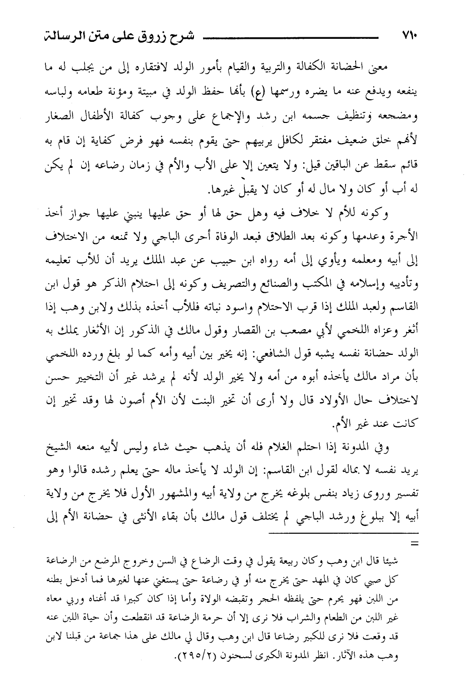 معنى الحضانة الكفالة والتربية والقيام بأمور الولد لافتقاره إلى من يجلب له ما ينفعه ويدفع عنه ما يضره ورسمها (ع) بأنها حفظ الولد في مبيتة ومؤنة طعامه ولباسه ومضجعه وتنظيف جسمه ابن رشد والإجماع على وجوب كفالة الأطفال الصغار لأنهم خلق ضعيف مفتقر لكافل يربيهم حتى يقوم بنفسه فهو فرض كفاية إن قام به قائم سقط عن الباقين قيل: ولا يتعين إلا على الأب والأم في زمان رضاعه إن لم يكن له أب أو كان ولا مال له أو كان لا يقبل غيرها.