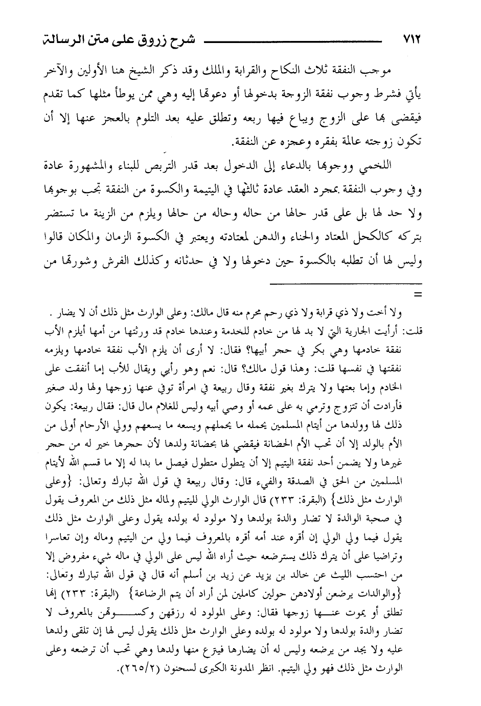 اللخمي ووجوبها بالدعاء إلى الدخول بعد قدر التربص للبناء والمشهورة عادة وفي وجوب النفقة بمجرد العقد عادة ثالثها في اليتيمة والكسوة من النفقة تجب بوجوبها ولا حد لها بل على قدر حالها من حاله وحاله من حالها ويلزم من الزينة ما تستضر بتركه كالكحل المعتاد والحناء والدهن لمعتادته ويعتبر في الكسوة الزمان والمكان قالوا وليس لها أن تطلبه بالكسوة حين دخولا ولا في حدثانه وكذلك الفرش وشورتها من