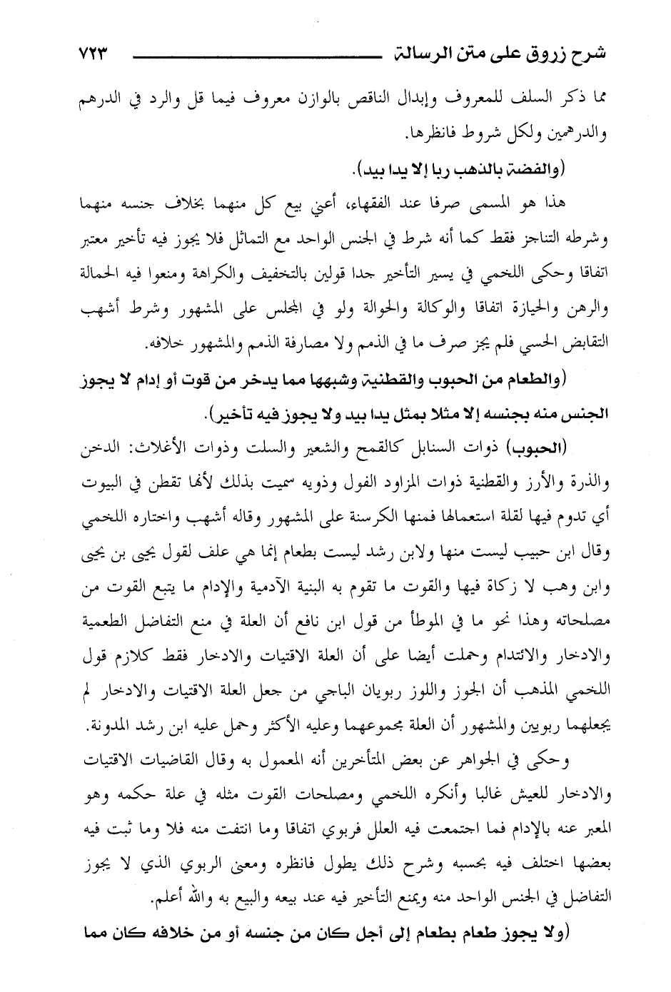 (والطعام من الحبوب والقطنية وشبهها مما يدخر من قوت أو إدام لا يجوز الجنس منه بجنسه إلا مثلا بمثل يدا بيد ولا يجوز فيه تأخير).