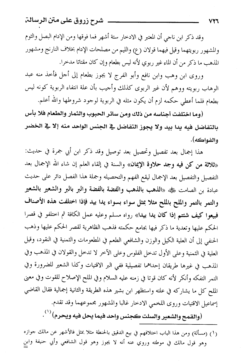 وقد ذكر ابن ناجي أن المعتبر في الادخار ستة أشهر فما فوقها ومن الإدام البصل والثوم والمشهور ربويتهما وقيل فيهما قولان (ع) والليم من مصلحات الإدام بخلاف النارنج ومشهور المذهب ما ذكر من أن الماء غير ربوي لأنه ليس بطعام وإن كان مقتاتا مدخرا.