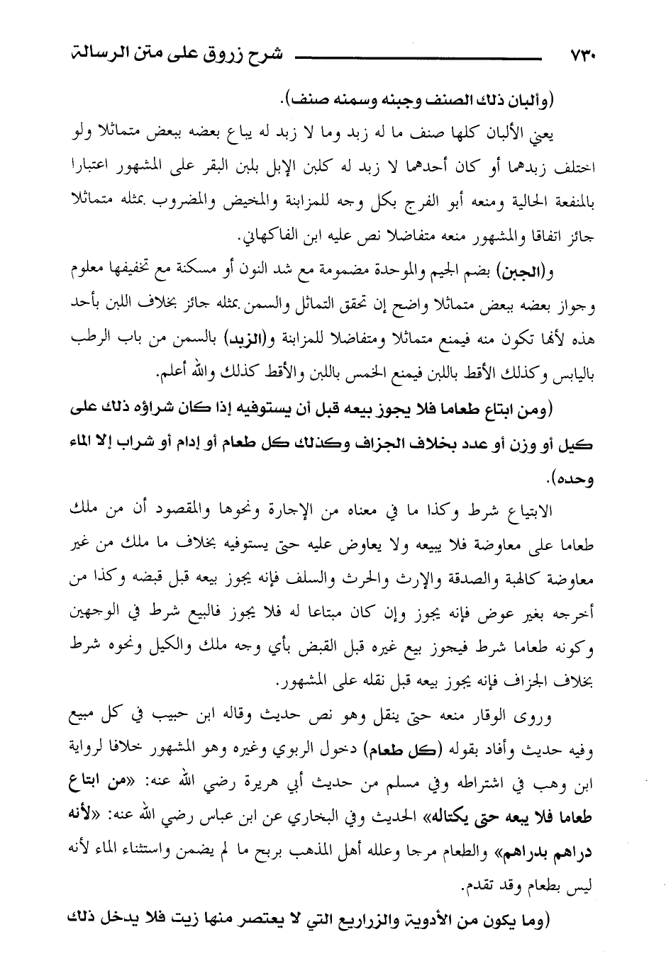 (ومن ابتاع طعاما فلا يجوز بيعه قبل أن يستوفيه إذا كان شراؤوه ذلك على كيل أو وزن أو عدد بخلاف الجزاف وكذلك كل طعام أو إدام أو شراب إلا الماء وحده).