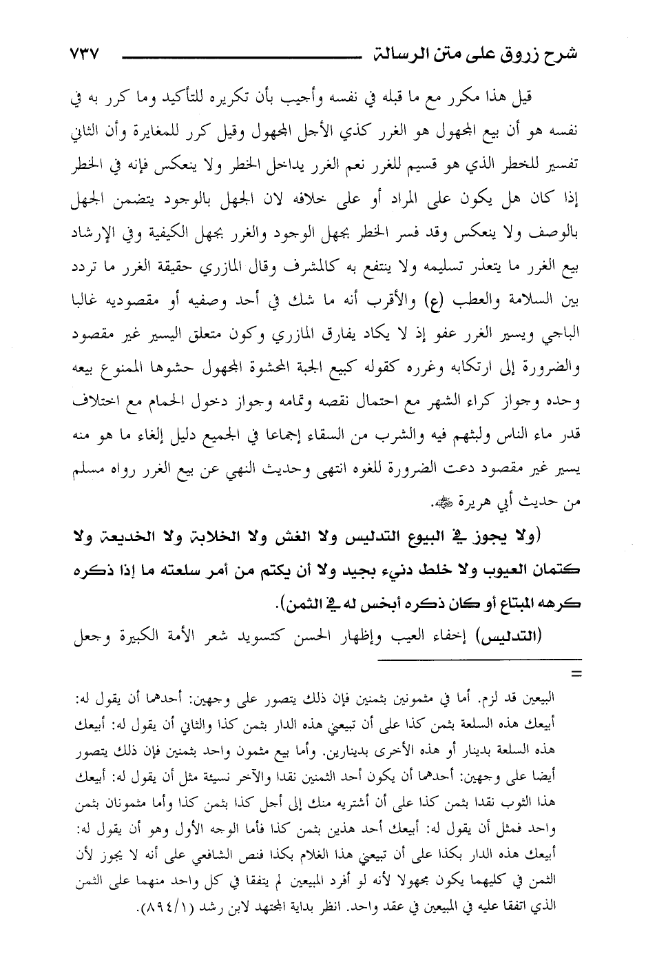 قيل هذا مكرر مع ما قبله في نفسه وأجيب بأن تكريره للتأكيد وما كرر به في نفسه هو أن بيع المجهول هو الغرر كذي الأجل المجهول وقيل كرر للمغايرة وأن الثاني تفسير للخطر الذي هو قسيم للغرر نعم الغرر يداخل الخطر ولا ينعكس فإنه في الخطر إذا كان هل يكون على المراد أو على خلافه لأن الجهل بالوجود يتضمن الجهل بالوصف ولا ينعكس وقد فسر الخطر بجهل الوجود والغرر بجهل الكيفية وفي الإرشاد بيع الغرر ما يتعذر تسليمه ولا ينتفع به كالمشرف وقال المازري حقيقة الغرر ما تردد بين السلامة والعطب (ع) والأقرب أنه ما شك في أحد وصفيه أو مقصودية غالبا الباجي ويسير الغرر عفو إذ لا يكاد يفارق المازري وكون متعلق اليسير غير مقصود والضرورة إلى ارتكابه وغرره كقوله كبيع الجبة المحشوة المجهول حشوها الممنوع بيعه وحده وجواز كراء الشهر مع احتمال نقصه وتمامه وجواز دخول الحمام مع اختلاف قدر ماء الناس ولبثهم فيه والشرب من السقاء إجماعا في الجميع دليل إلغاء ما هو منه يسير غير مقصود دعت الضرورة للغوه انتهى وحديث النهي عن بيع الغرر رواه مسلم من حديث أبي هريرة رضي الله عنه.