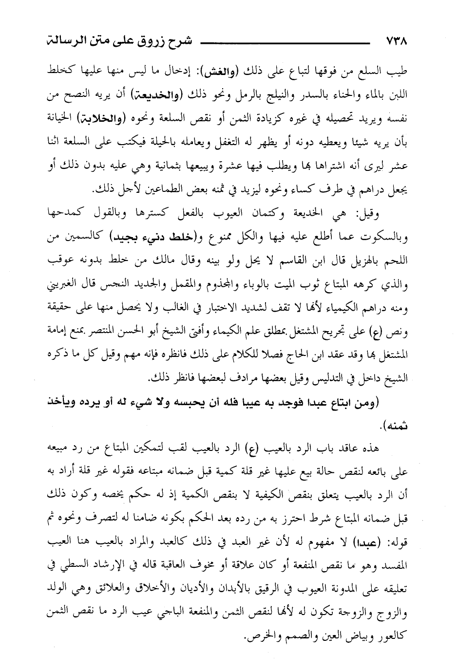 هذه عاقد باب الرد بالعيب (ع) الرد بالعيب لقب لتمكين المبتاع من رد مبيعه على بائعه لنقص حالة بيع عليها غير قلة كمية قبل ضمانه مبتاعه فقوله غير قلة أراد به أن الرد بالعيب يتعلق بنقص الكيفية لا بنقص الكمية إذ له حكم يخصه وكون ذلك قبل ضمانه المبتاع شرط احترز به من رده بعد الحكم بكونه ضامنا له لتصرف ونحوه ثم قوله: (عبدا) لا مفهوم له لأن غير العبد في ذلك كالعبد والمراد بالعيب هنا العيب المفسد وهو ما نقص المنفعة أو كان علاقة أو مخوف العاقبة قاله في الإرشاد السطي في تعليقه على المدونة العيوب في الرقيق بالأبدان والأديان والأخلاق والعلائق وهي الولد والزوج والزوجة تكون له لأنها لنقص الثمن والمنفعة الباجي عيب الرد ما نقص الثمن كاعلور وبياض العين والصمم والخرص.