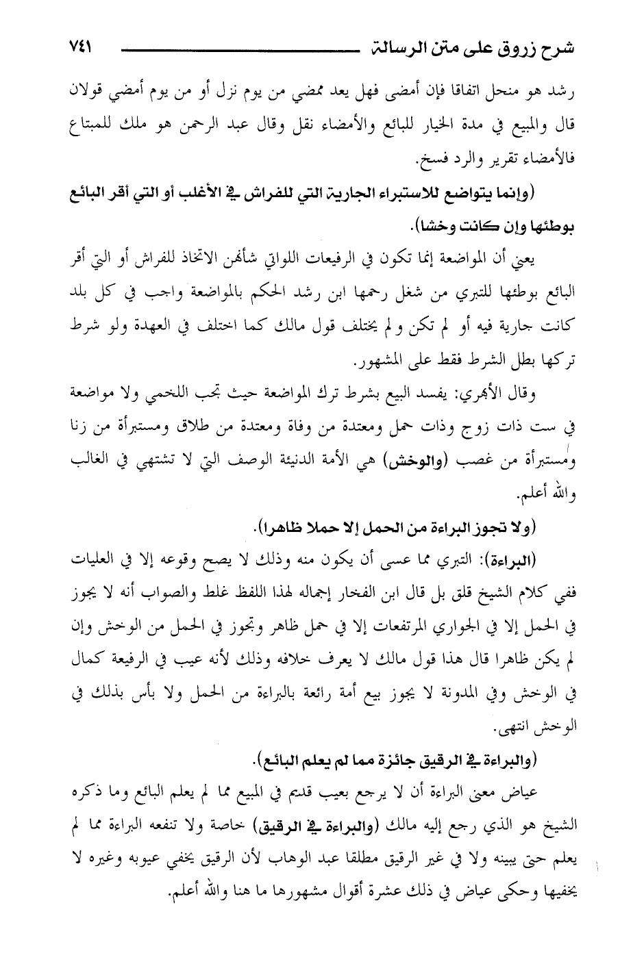 عياض معنى البراءة أن لا يرجع بعيب قديم في المبيع مما لم يعلم البائع وما ذكره الشيخ هو الذي رجع إليه مالك (والبراءة في الرقيق) خاصة ولا تنفعه البراءة مما لم يعلم حتى يبينه ولا في غير الرقيق مطلقا عبد الوهاب لأن الرقيق يخفي عيوبه وغيره لا يخفيها وحكى عياض في ذلك عشرة أقوال مشهورها ما هنا والله أعلم.