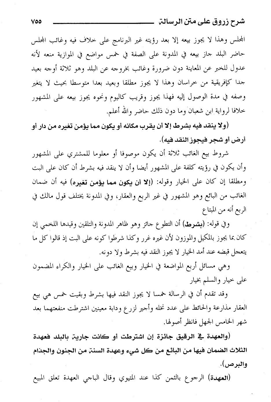 وقد تقدم أن في الرسالة خمسا لا يجوز النقد فيها بشرط وبقيت خمس هي بيع العقار مذارعة والحائط على عدد نخله وأجير لزرع ودابة معينين اشترطت منفعتهما بعد شهر الخامس الجهل فانظر أصولها.